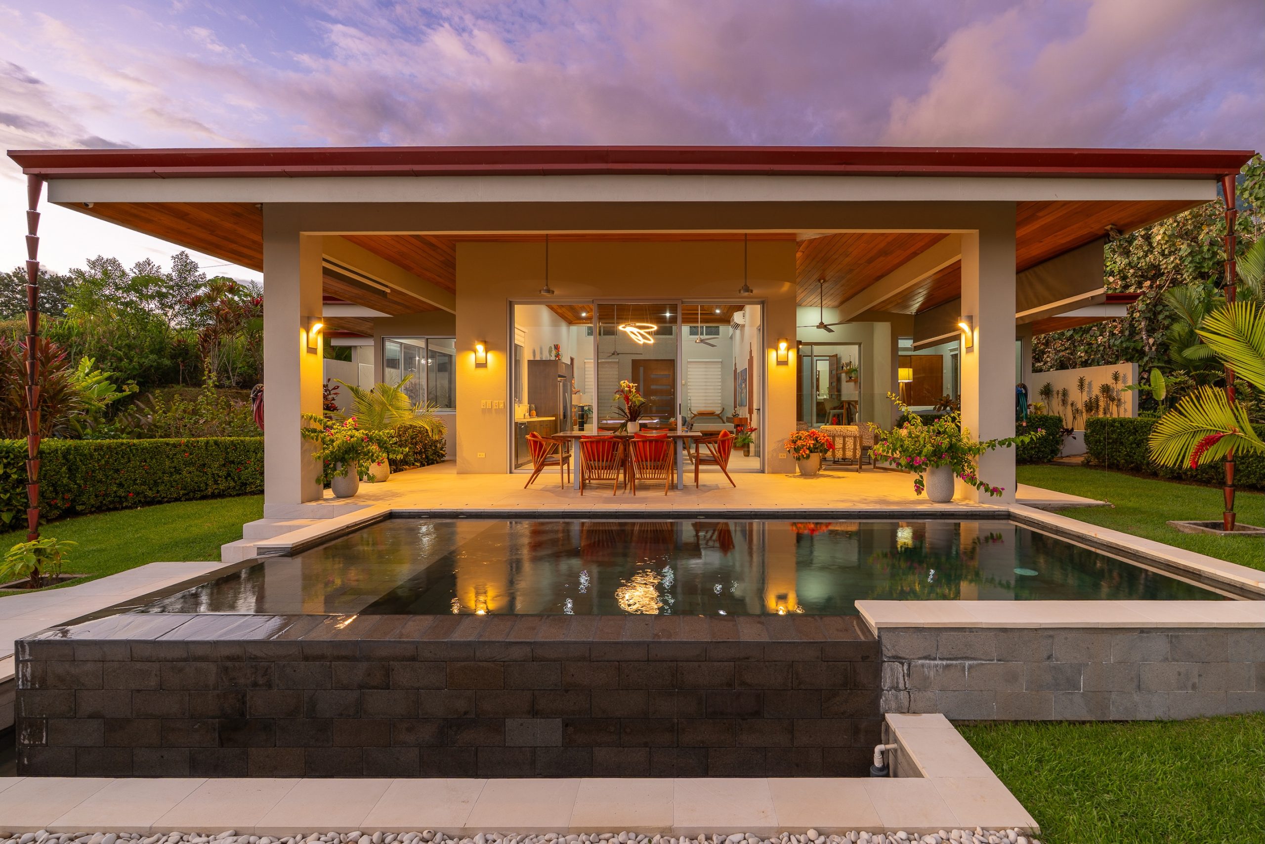 Desde la cocina, dos grandes puertas corredizas conducen a un área exterior de entretenimiento de dos niveles y a una elegante piscina contemporánea con acabados en piedra natural gris. La piscina incluye una plataforma baja con banco integrado y un borde infinito que se fusiona visualmente con el océano y las montañas del horizonte. En días despejados, el agua refleja el cielo, mientras que al atardecer se transforma en el escenario perfecto para disfrutar de espectaculares puestas de sol con tonos vibrantes sobre el Pacífico. Una amplia terraza complementa este espacio, ideal tanto para recibir invitados como para relajarse en total armonía con la naturaleza.