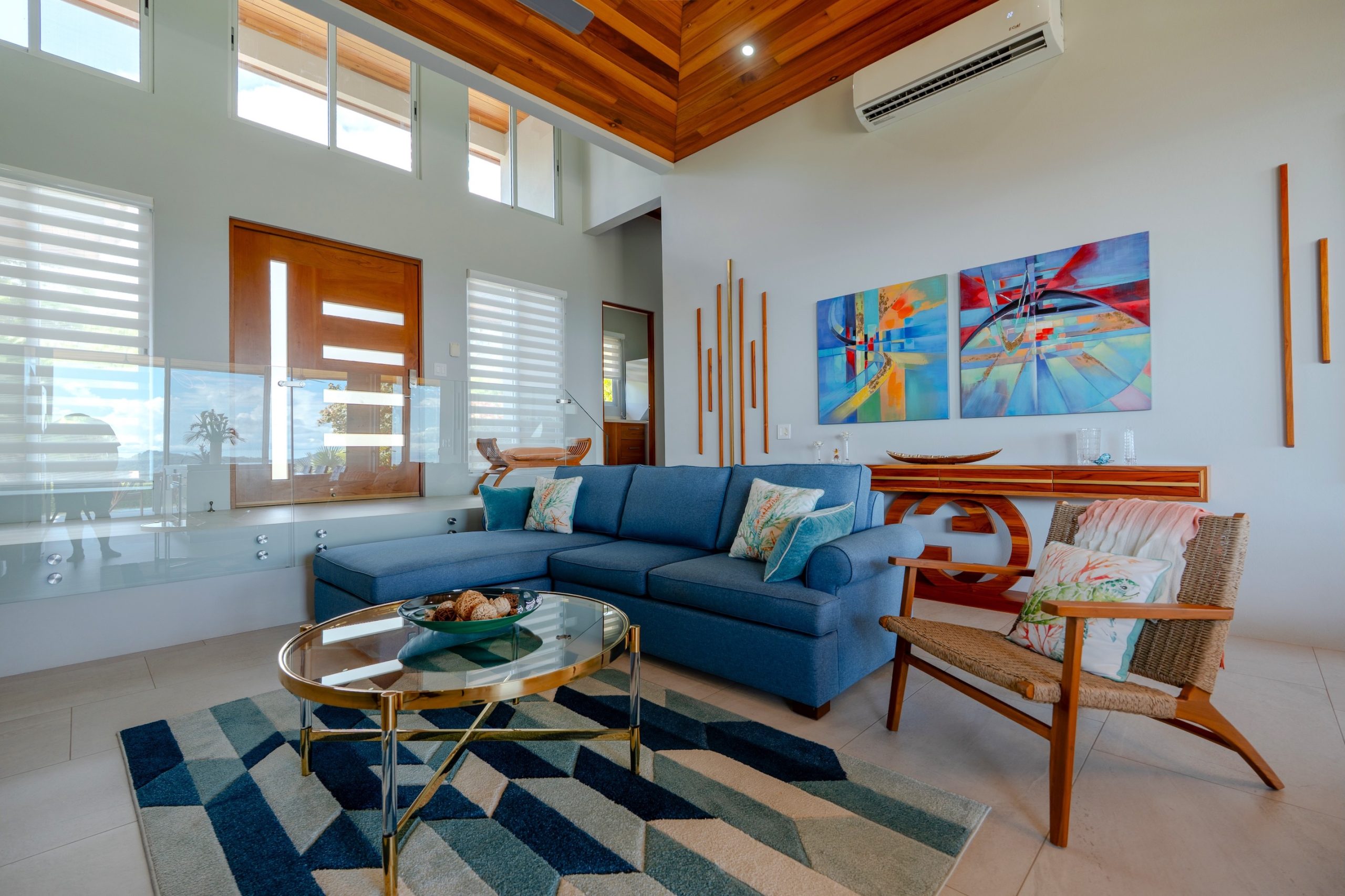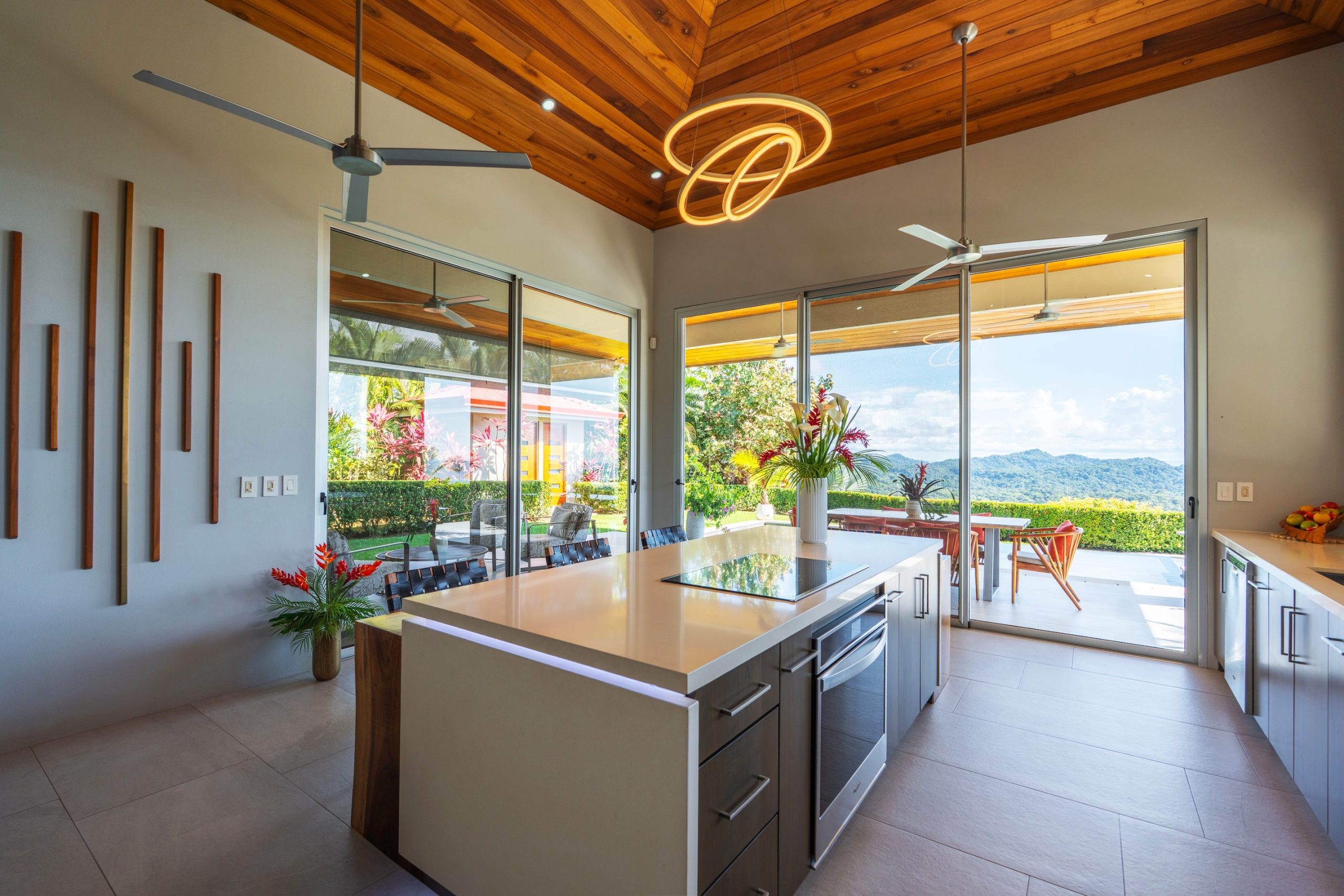 The home stands out for its modern and contemporary architecture, with an open-concept design that prioritizes clean, elegant lines. Large windows and sliding glass doors harmoniously integrate the interior spaces with the exterior surroundings, which are lush tropical gardens. From virtually every area of the house, one can enjoy unparalleled panoramic views of the Pacific Ocean, Caño Island, and the verdant mountains.