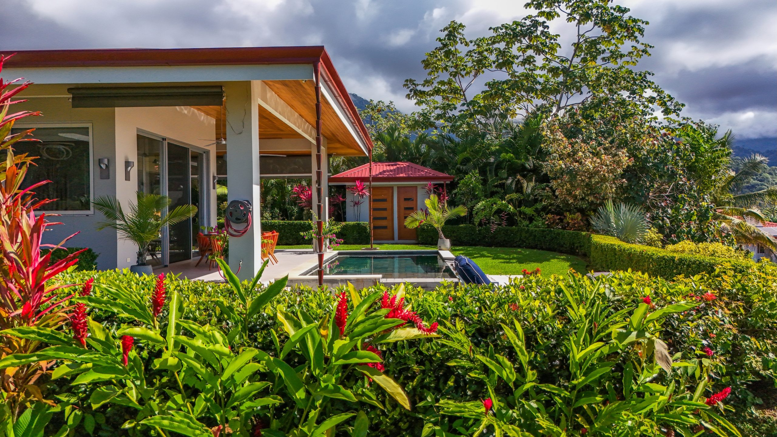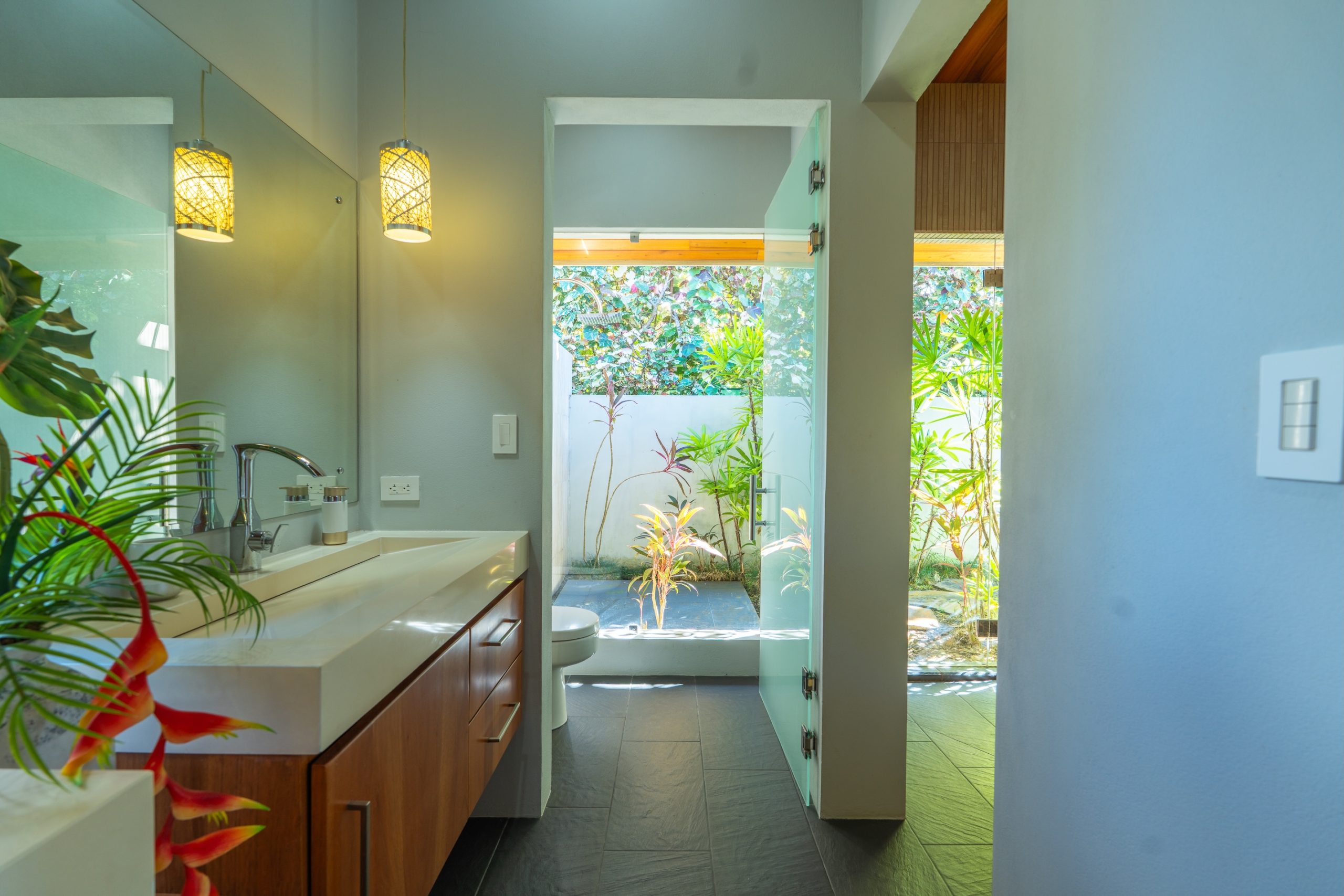 La casa cuenta también con un segundo baño completo de generosas dimensiones, diseñado con ducha interior y acceso a una ducha exterior mediante puertas de cristal, una característica que complementa de manera ideal el estilo de vida tropical de Costa Rica sin sacrificar privacidad ni confort. Adicionalmente, dispone de área de lavandería completamente equipada, amplio estacionamiento privado y un baño exterior de dos piezas.