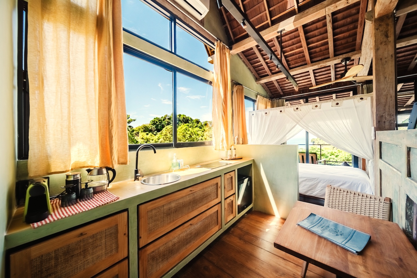 Two wooden villas , each with a kitchenette, spacious bathroom with bathtub and shower, double sinks and separate toilet.
