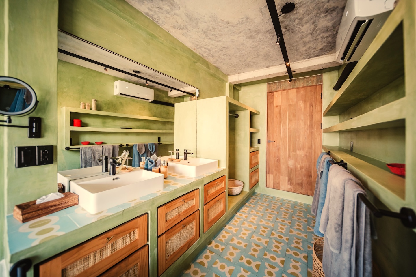 Two master suites , both with en-suite bathrooms: one with bathtub and shower, and the other with double showers (indoor and outdoor), double sinks and separate private bathroom.