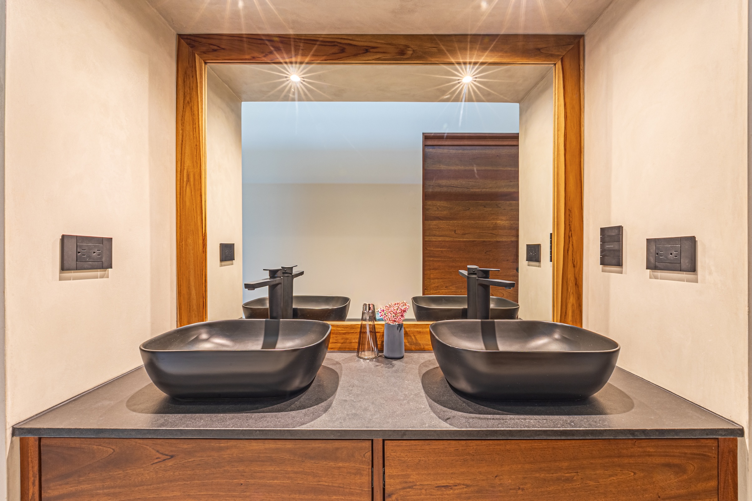 A floating staircase leads to the upstairs bedrooms. Two spacious bedrooms each with their own on suite full bathroom and ocean view private terrace.