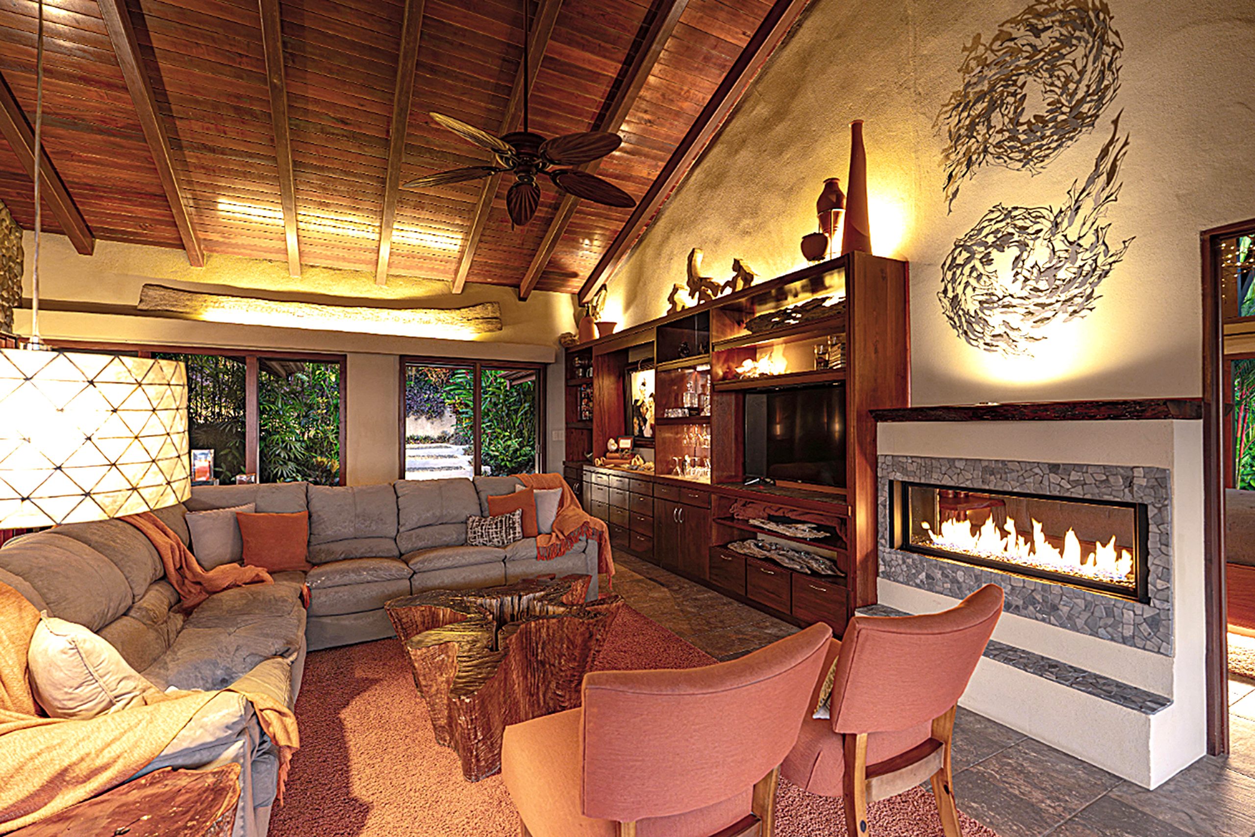 The design seamlessly integrates indoor and outdoor spaces, with open social areas, a spacious kitchen designed for gathering, and a double-sided fireplace that adds warmth and character. The large terrace with pool becomes the focal point, offering open views of the ocean and jungle, along with areas for lounging, dining, and entertaining outdoors.