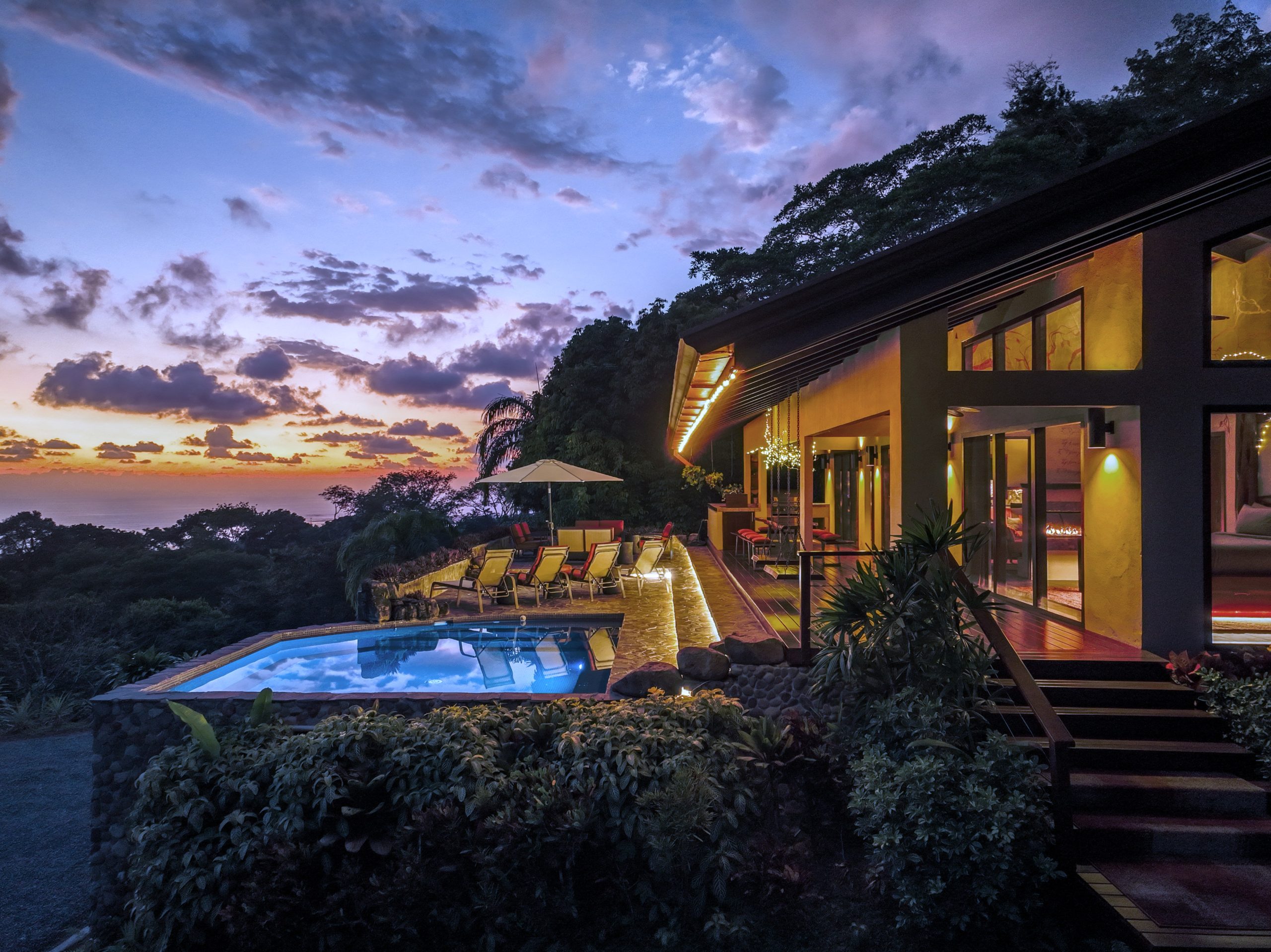 La casa, de 258 m², está cuidadosamente orientada para aprovechar una vista panorámica de 180° hacia el Pacífico, regalando atardeceres espectaculares que abarcan desde la Península de Osa hasta la Isla del Caño. La constante brisa marina y de montaña mantiene el ambiente fresco y agradable durante todo el día.