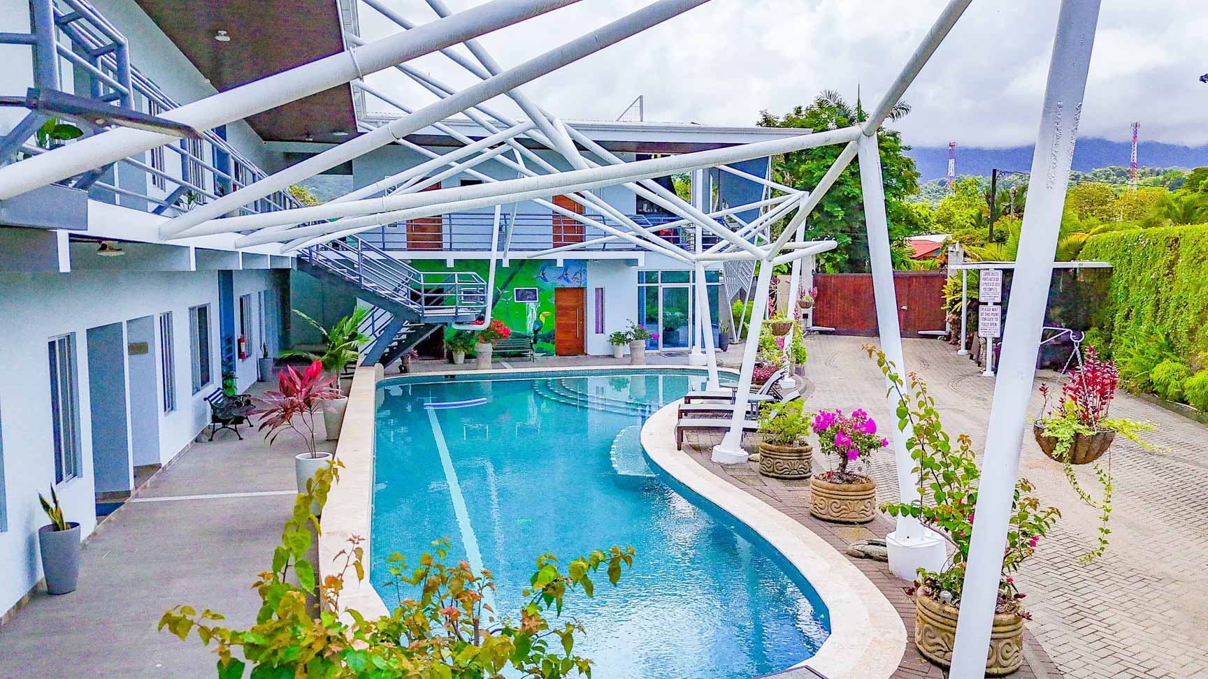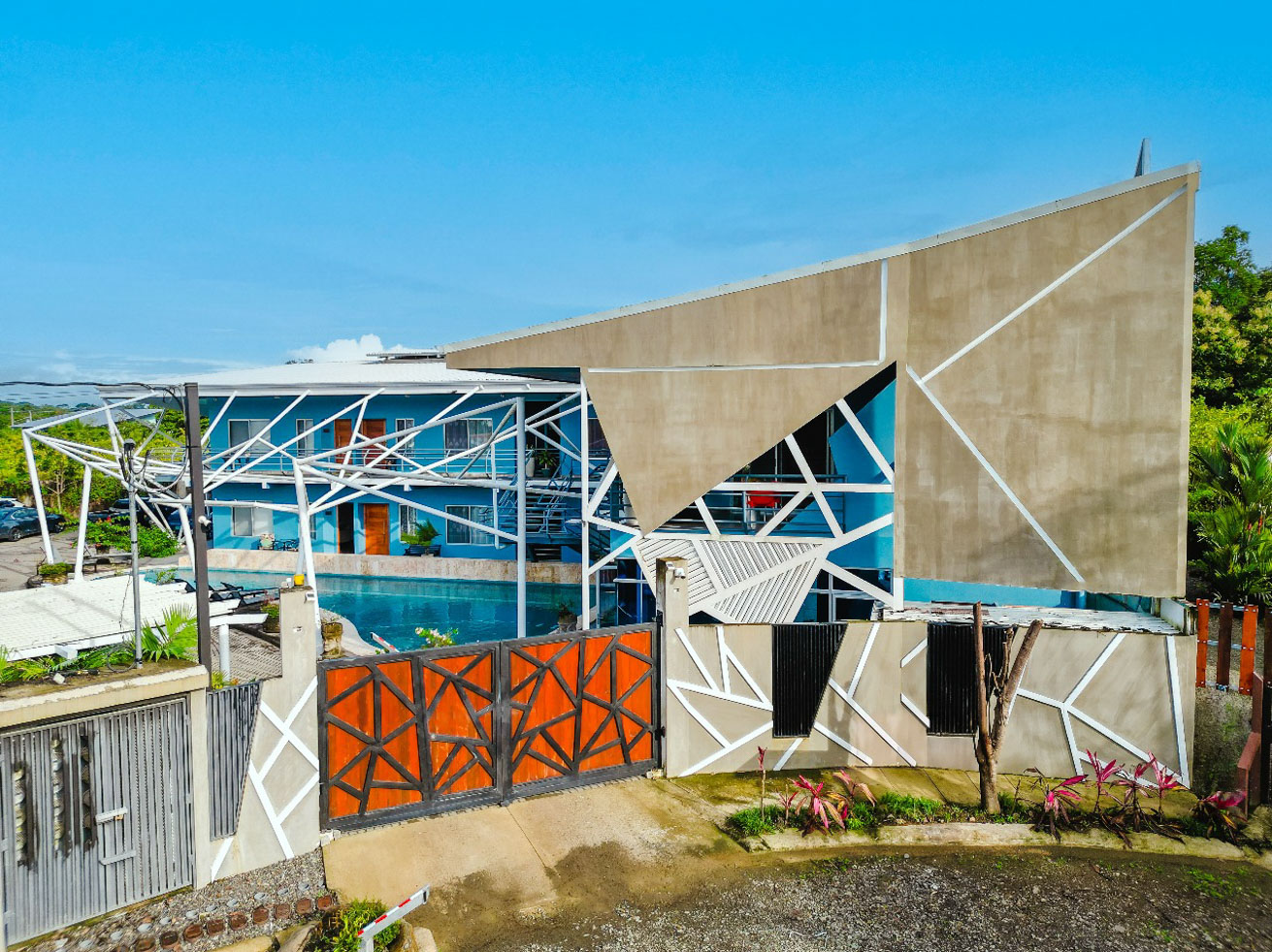 Angular shapes, crisp lines, and intersecting planes create a sense of movement and energy that extends from the building’s facade to the perimeter fence, the entrance gate, and the dramatic white structure that soars over the large pool. The deep blue exterior , accompanied by a vibrant rainforest mural , white accents, and a turquoise pool, evokes the very essence of a coastal tropical paradise: cool, inviting, and perfectly suited to the region’s climate.