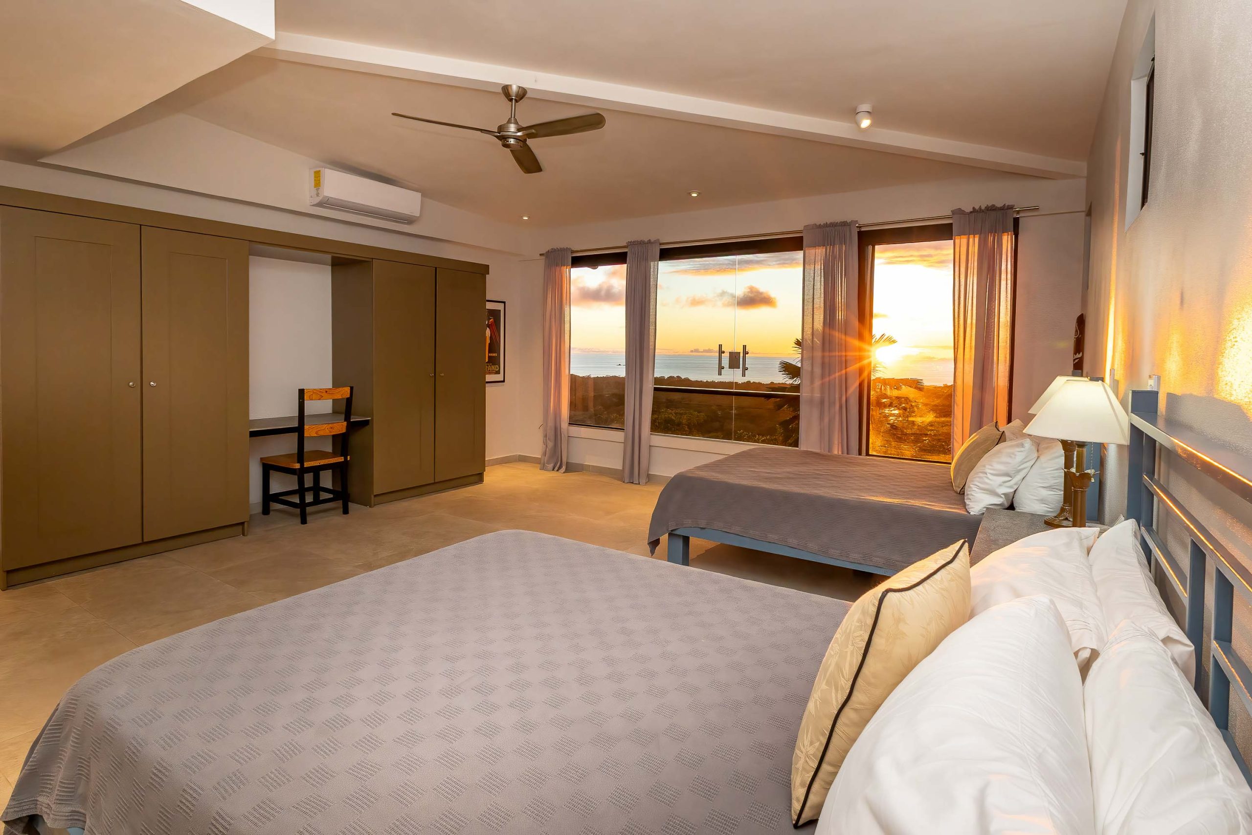 Inside, the villa has been carefully designed for relaxation and well-being. Several of its bedrooms boast spectacular ocean views and feature spacious spa-like bathrooms. The focal point of the house is an extraordinary split-level living room, surrounded by the pool—an architectural feature that allows for unforgettable sunsets to be enjoyed from every angle. The expansive wraparound terrace, complemented by a large built-in jacuzzi, creates a harmonious transition between the sophisticated interior spaces and the tropical outdoor living.