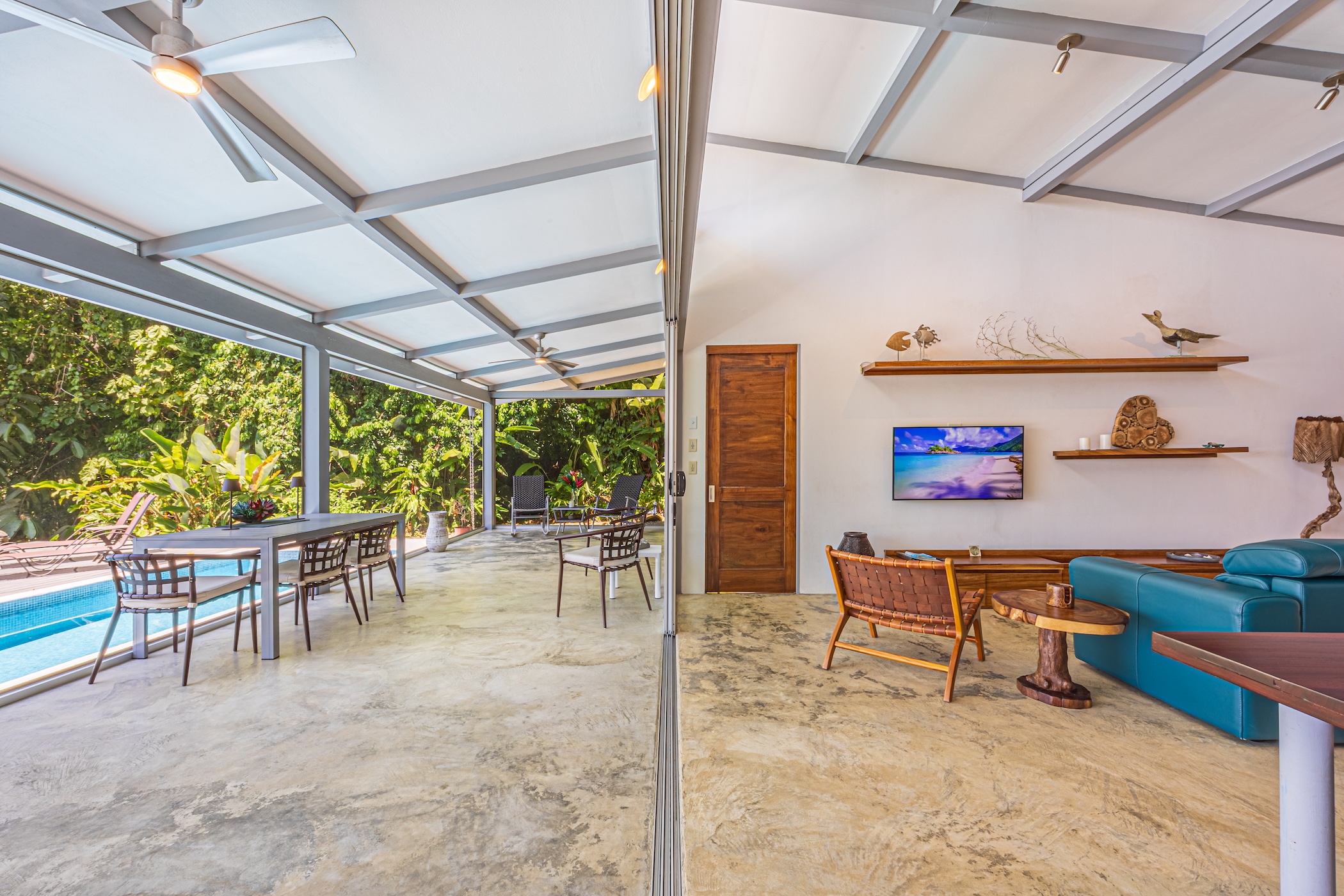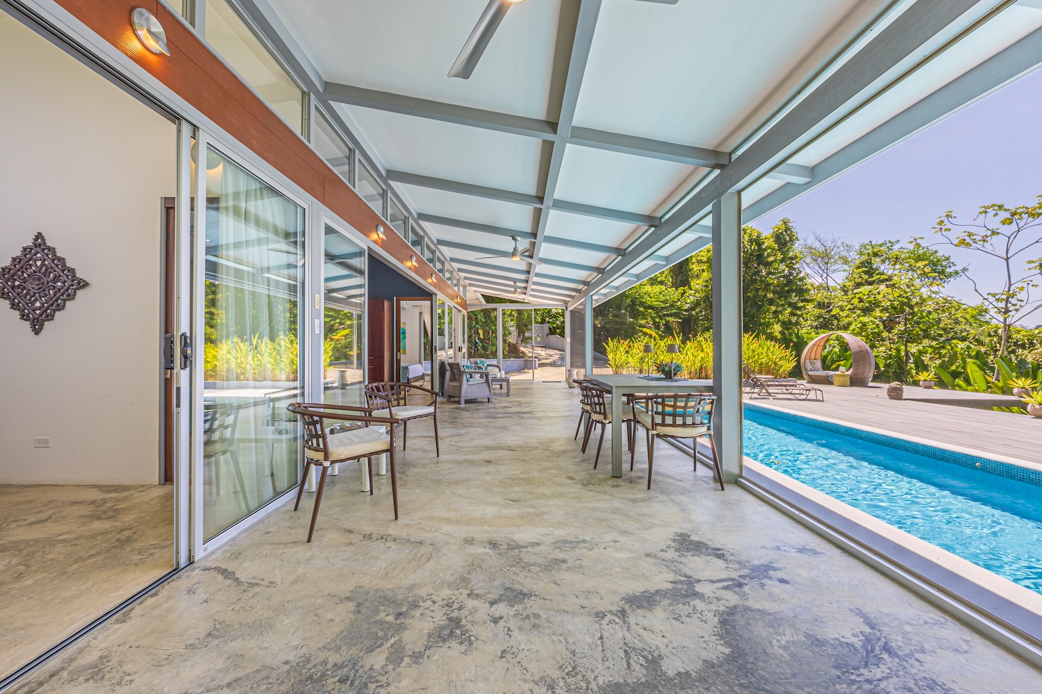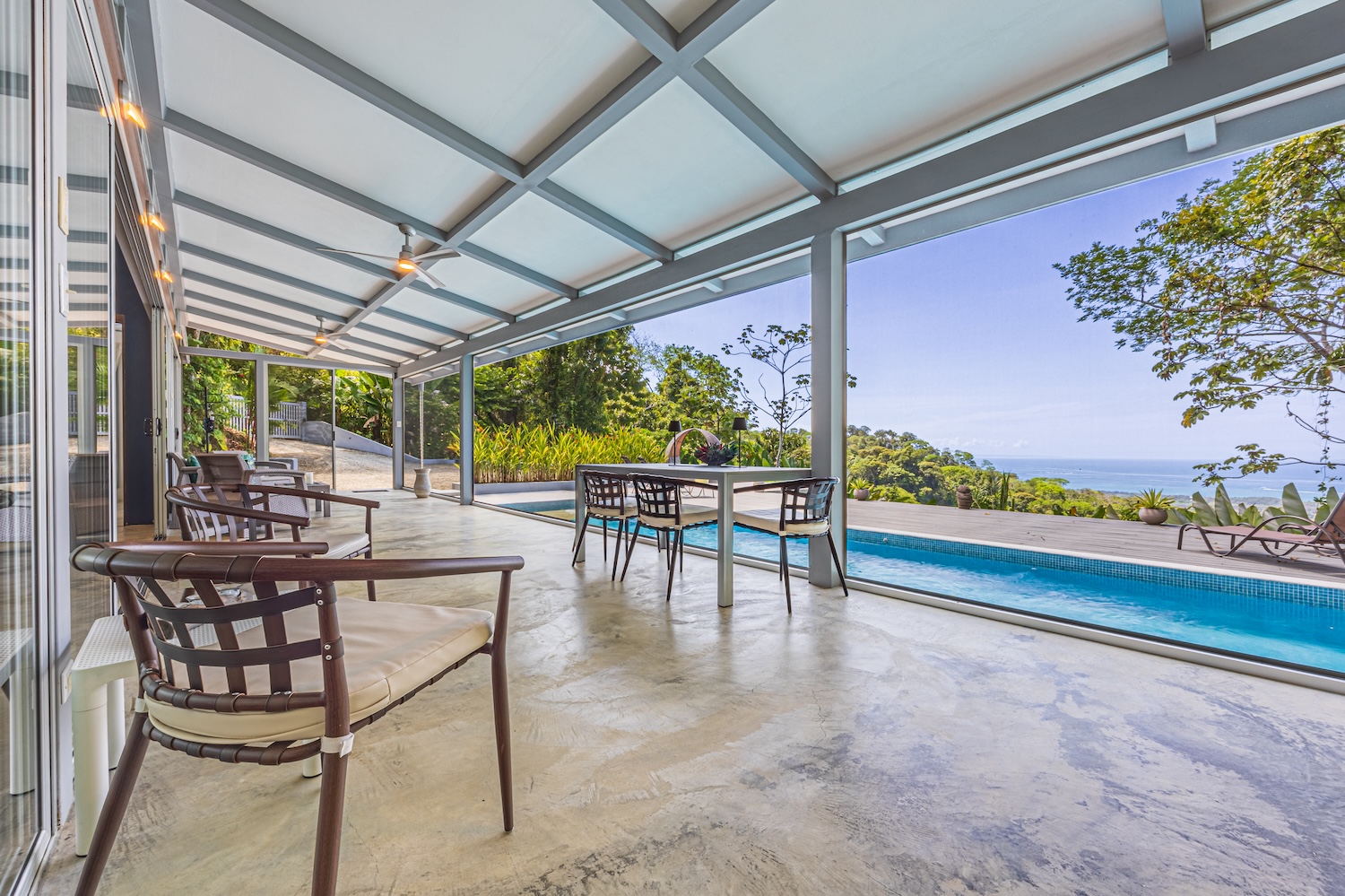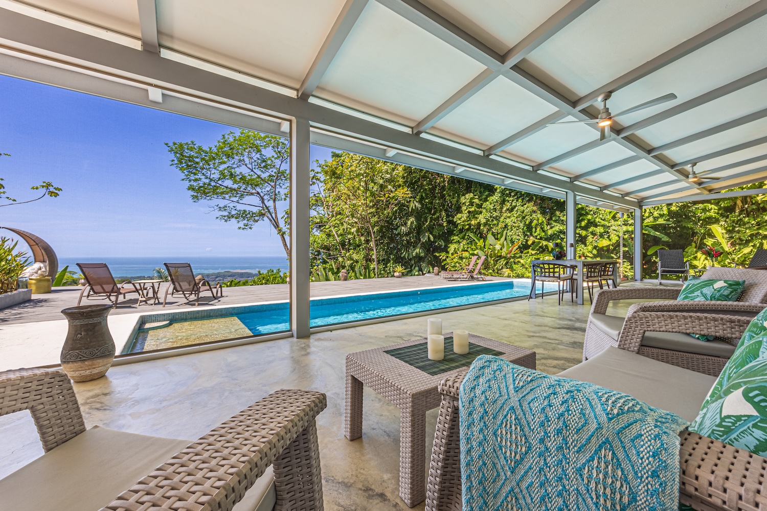 The true charm lies in the outdoor spaces: a covered terrace ideal for enjoying the climate and views, along with a spacious pool area perfect for entertaining or relaxing.