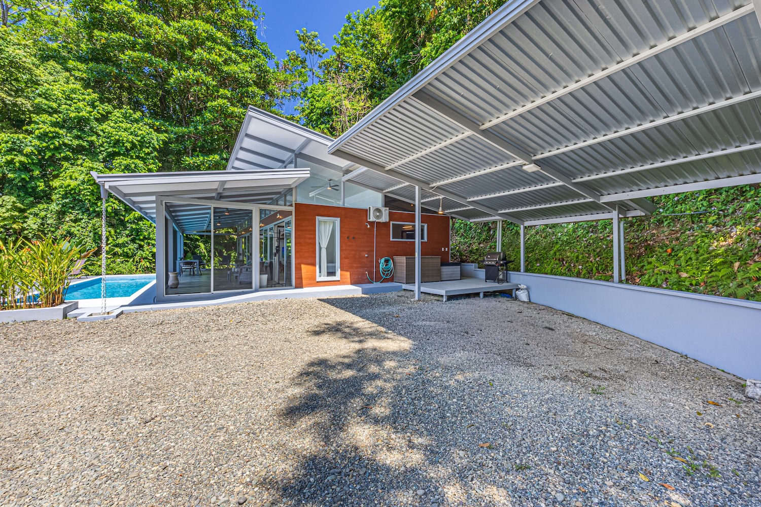 El verdadero encanto se encuentra en sus espacios exteriores: una terraza cubierta ideal para disfrutar del clima y las vistas, junto a una amplia zona de piscina perfecta para reuniones o momentos de descanso.