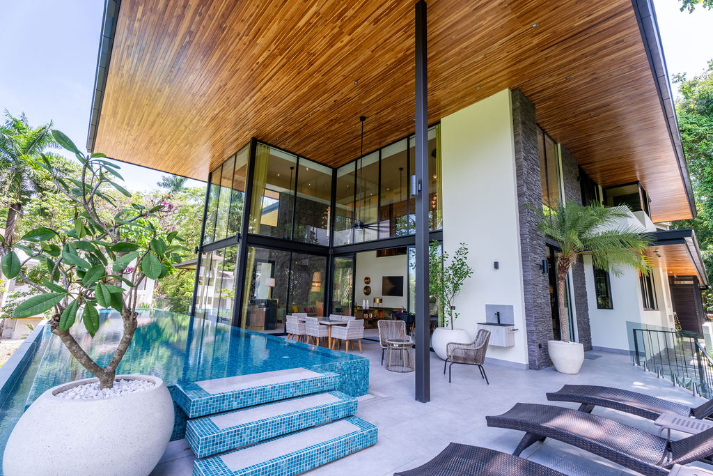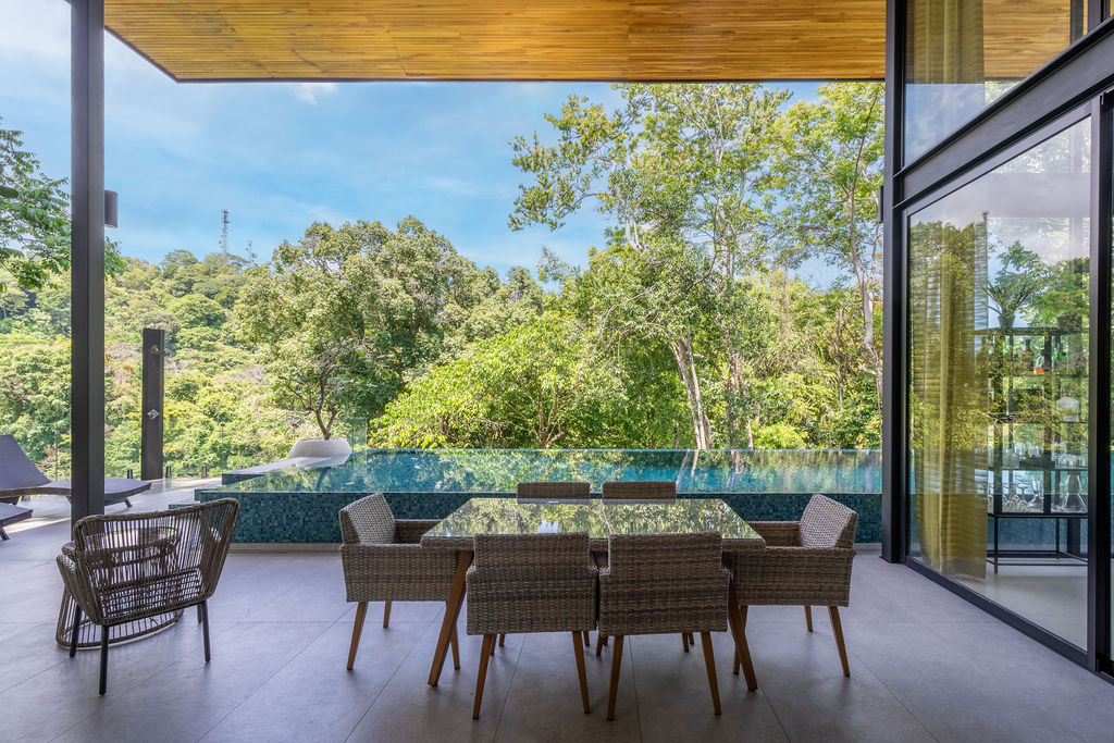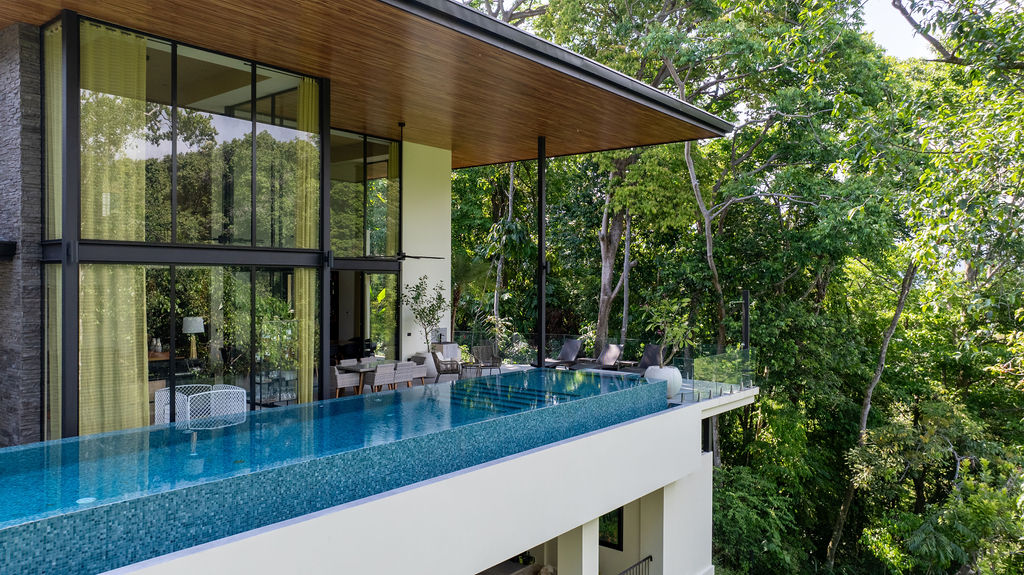 Una de las caracterÃsticas más destacadas de esta residencia es su espectacular piscina infinita, enmarcada por el verde profundo de la selva tropical. Con un relajante tono aguamarina, ofrece un entorno ideal para disfrutar tanto de un baño al atardecer como de reuniones inolvidables bajo las estrellas.