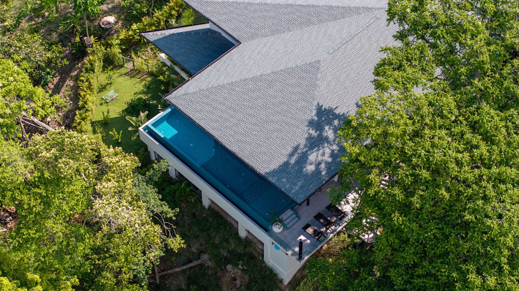 One of the most striking features of this residence is its spectacular infinity pool , framed by the deep green of the tropical rainforest. With a soothing aquamarine hue, it offers an ideal setting for enjoying both a sunset swim and unforgettable gatherings under the stars.