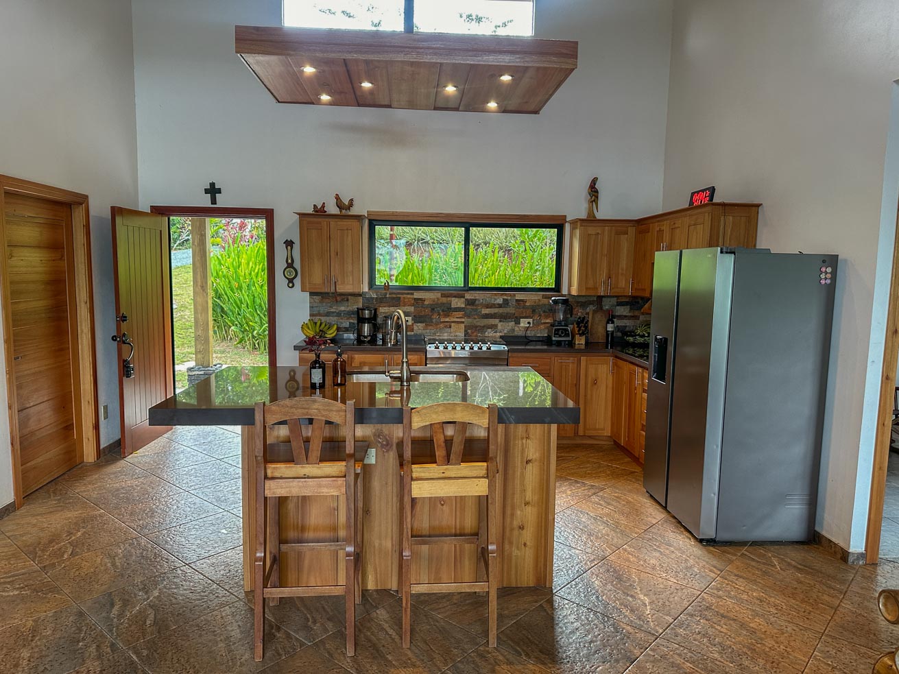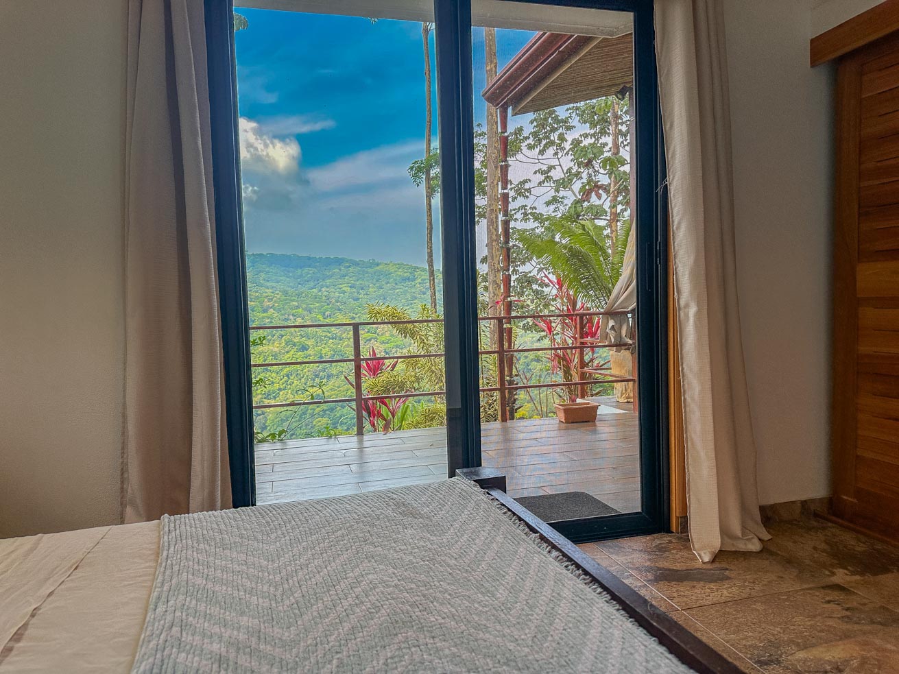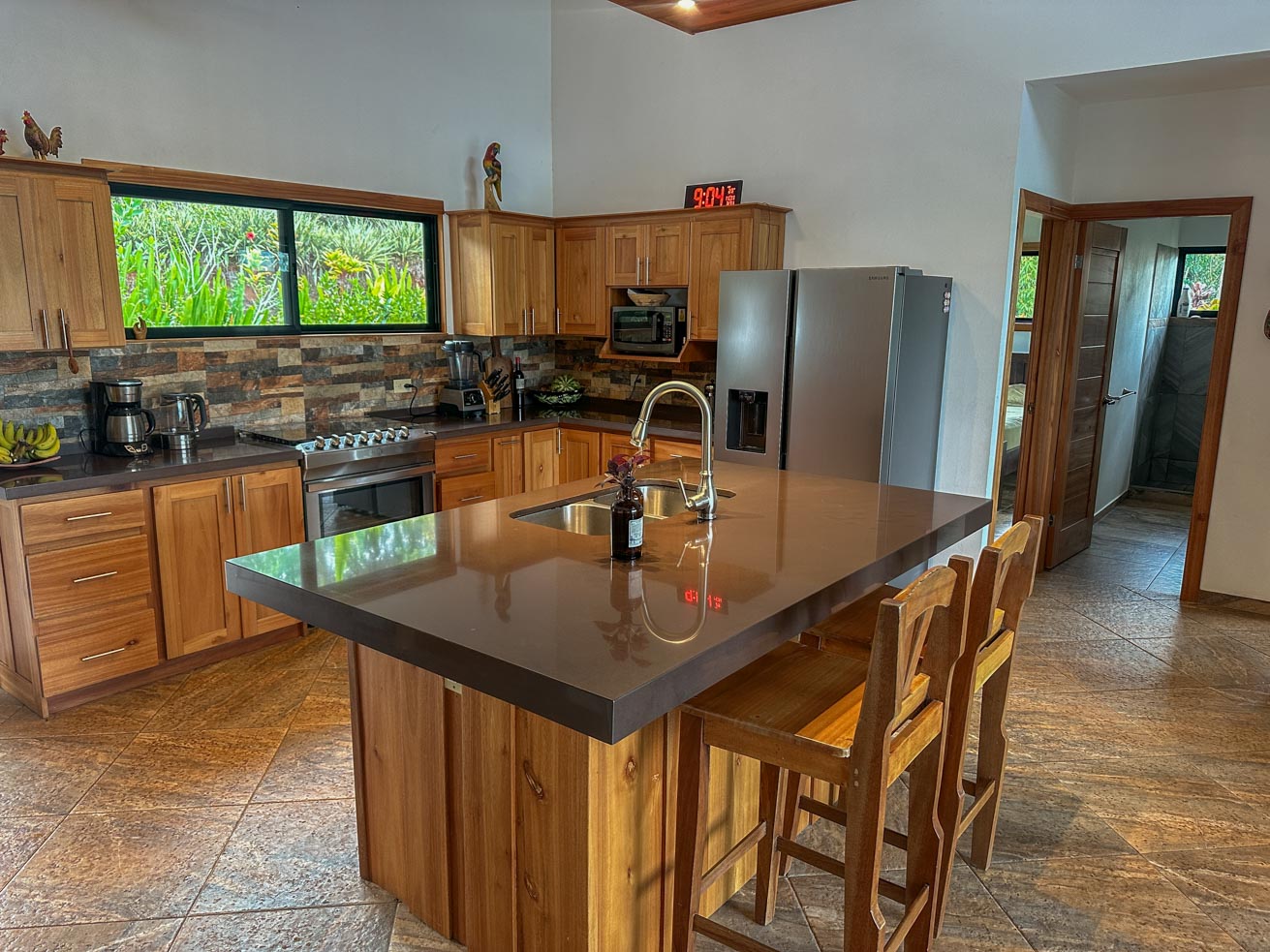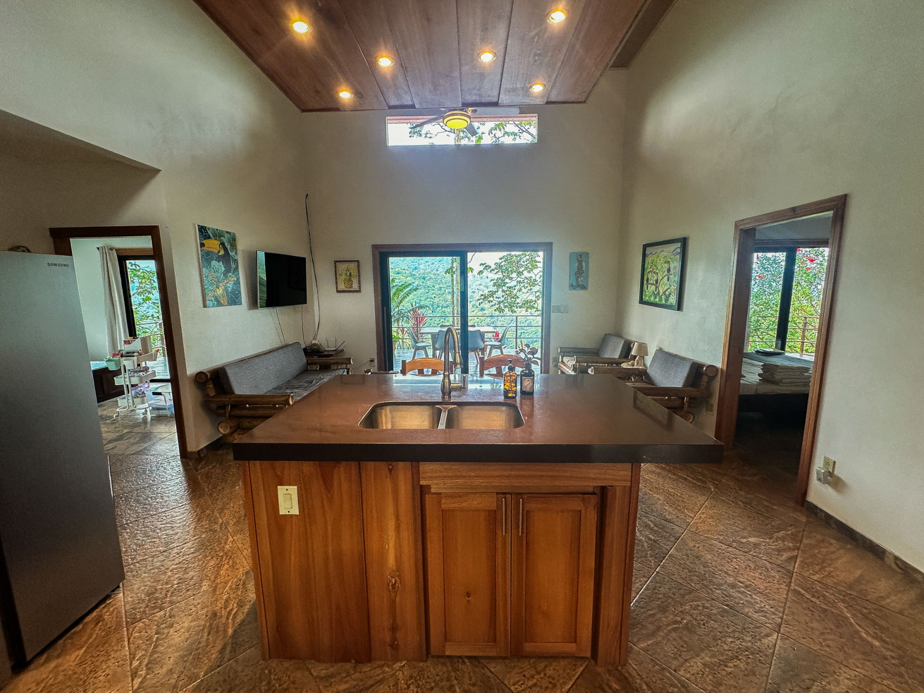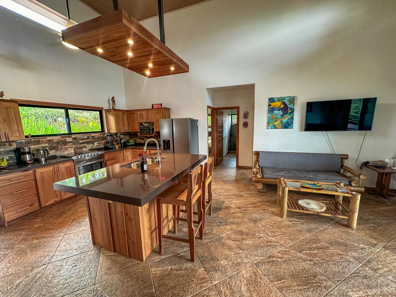 La cocina, completamente equipada, se integra con la isla de desayuno y la sala de estar, desde donde se aprecian vistas ininterrumpidas hacia la selva y las montañas. Este espacio se conecta con un gran patio trasero techado que ofrece panoramas simplemente espectaculares. La terraza cuenta con áreas de descanso adicionales, un segundo comedor y una zona de parrilla, perfecta para compartir. Dos de los tres dormitorios tienen acceso directo a este patio, donde las vistas abiertas, las campanas de viento, la iluminación ambiental y la vegetación en macetas crean una atmósfera ideal para el descanso. El estudio añade un valor extra, haciendo de esta casa un hogar sumamente versátil.