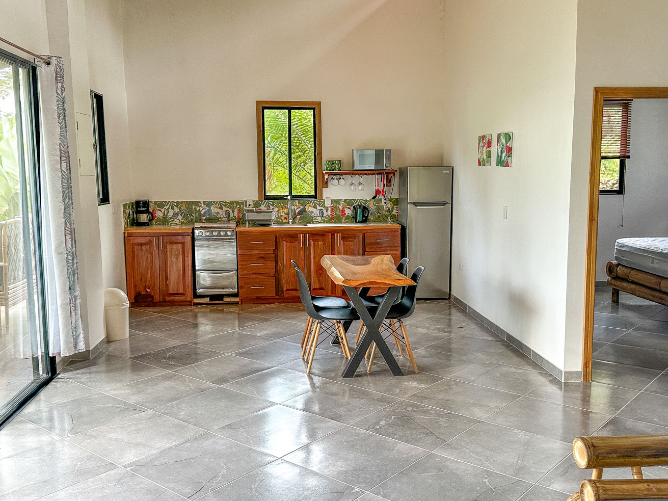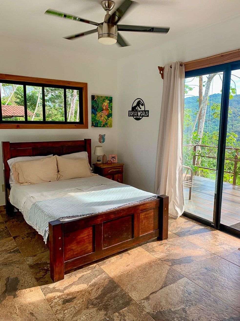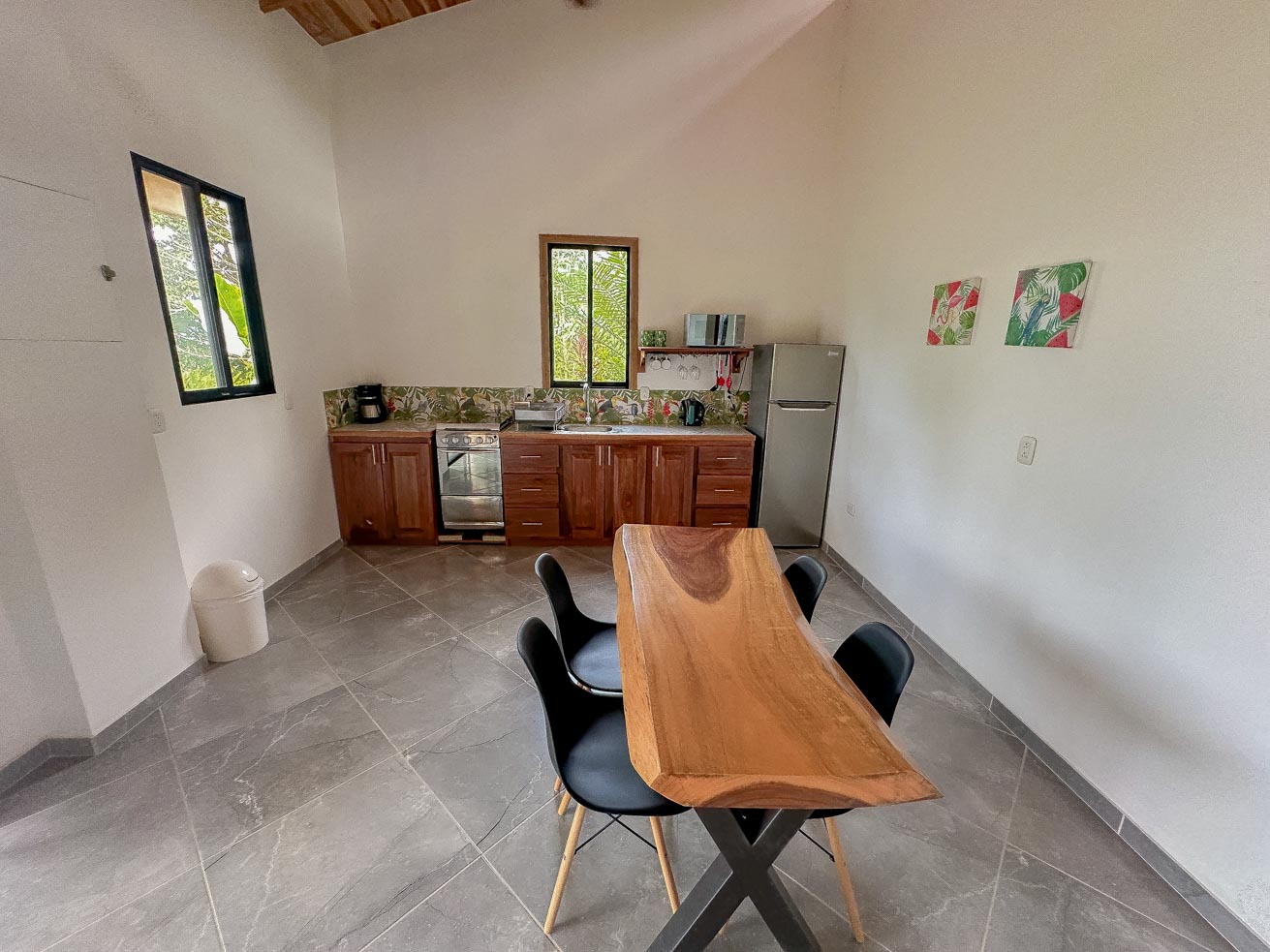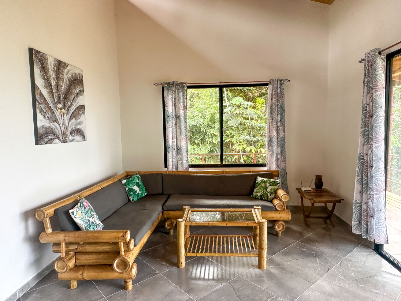 La cocina, completamente equipada, se integra con la isla de desayuno y la sala de estar, desde donde se aprecian vistas ininterrumpidas hacia la selva y las montañas. Este espacio se conecta con un gran patio trasero techado que ofrece panoramas simplemente espectaculares. La terraza cuenta con áreas de descanso adicionales, un segundo comedor y una zona de parrilla, perfecta para compartir. Dos de los tres dormitorios tienen acceso directo a este patio, donde las vistas abiertas, las campanas de viento, la iluminación ambiental y la vegetación en macetas crean una atmósfera ideal para el descanso. El estudio añade un valor extra, haciendo de esta casa un hogar sumamente versátil.