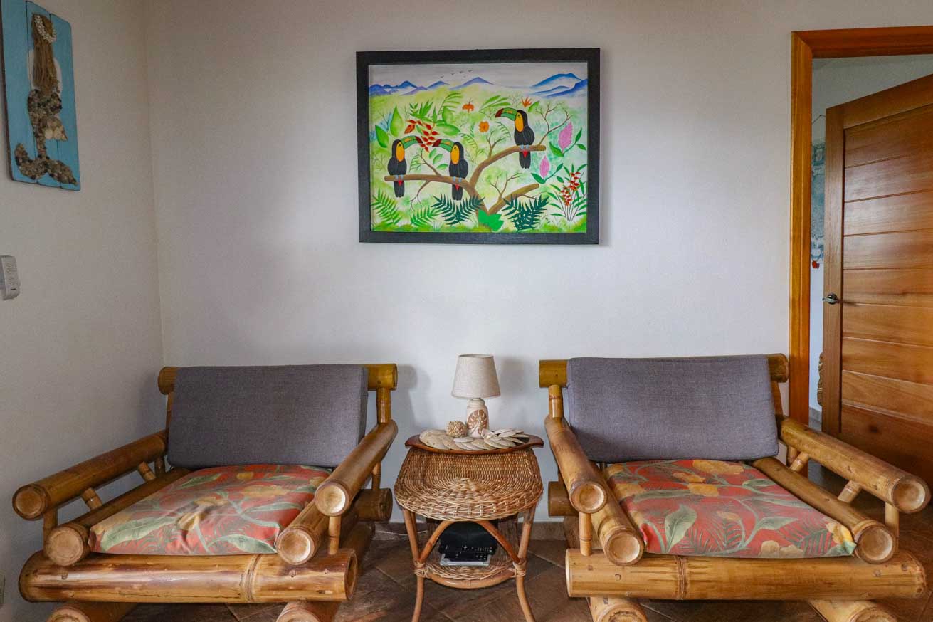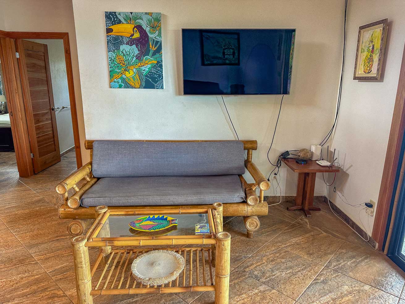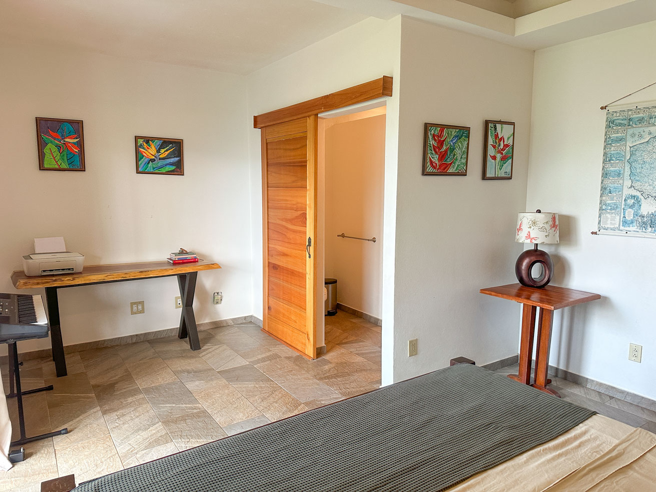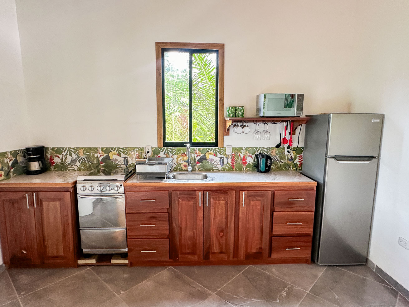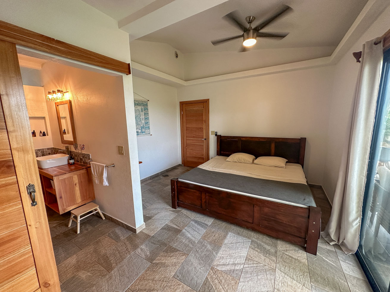 La cocina, completamente equipada, se integra con la isla de desayuno y la sala de estar, desde donde se aprecian vistas ininterrumpidas hacia la selva y las montañas. Este espacio se conecta con un gran patio trasero techado que ofrece panoramas simplemente espectaculares. La terraza cuenta con áreas de descanso adicionales, un segundo comedor y una zona de parrilla, perfecta para compartir. Dos de los tres dormitorios tienen acceso directo a este patio, donde las vistas abiertas, las campanas de viento, la iluminación ambiental y la vegetación en macetas crean una atmósfera ideal para el descanso. El estudio añade un valor extra, haciendo de esta casa un hogar sumamente versátil.