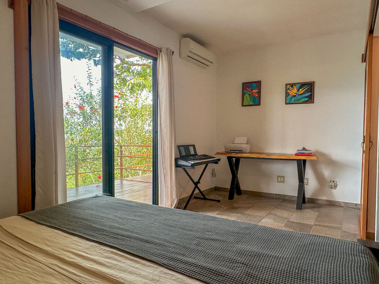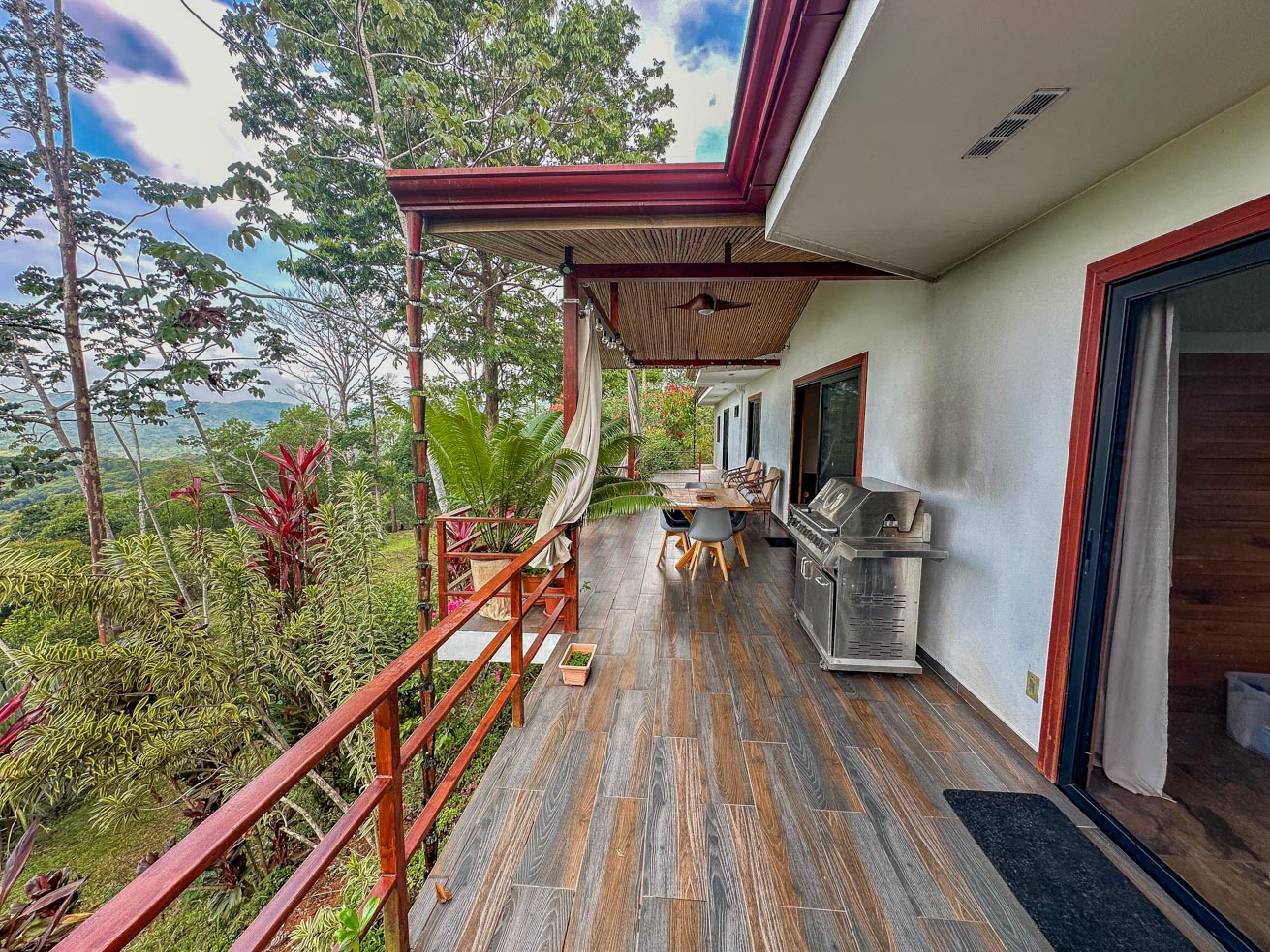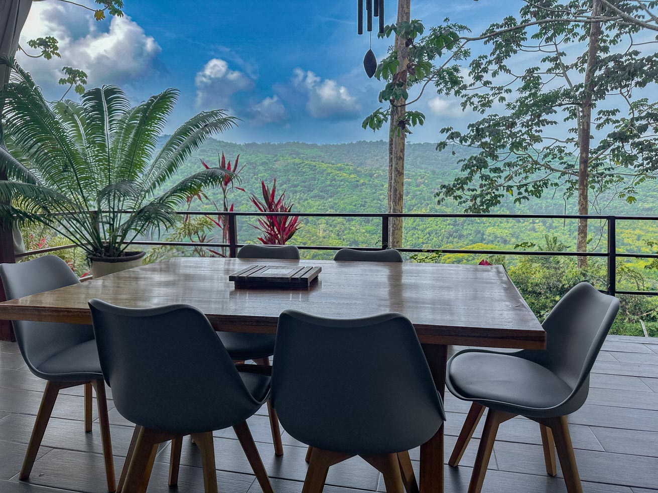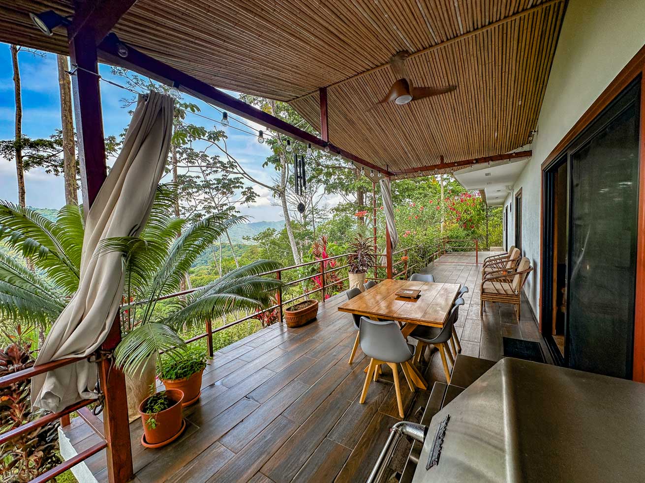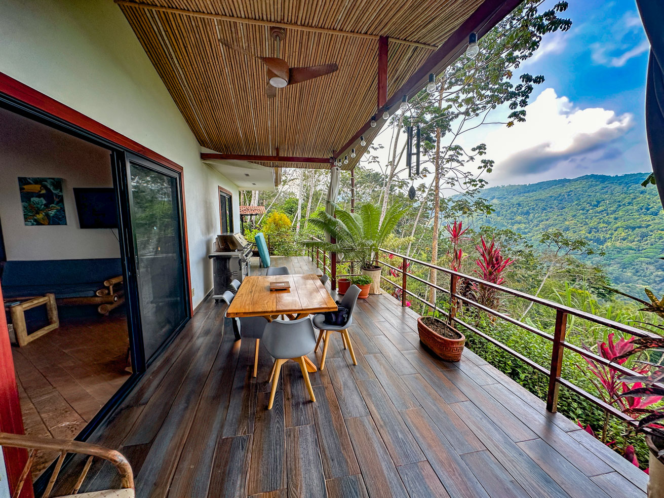 The fully equipped kitchen flows seamlessly into the breakfast island and living room, offering uninterrupted views of the rainforest and mountains. This space connects to a large covered back patio with simply spectacular panoramas. The terrace features additional seating areas, a second dining area, and a barbecue area, perfect for entertaining. Two of the three bedrooms have direct access to this patio, where open views, wind chimes, ambient lighting, and potted plants create an ideal atmosphere for relaxation. The study adds extra value, making this house an exceptionally versatile home.