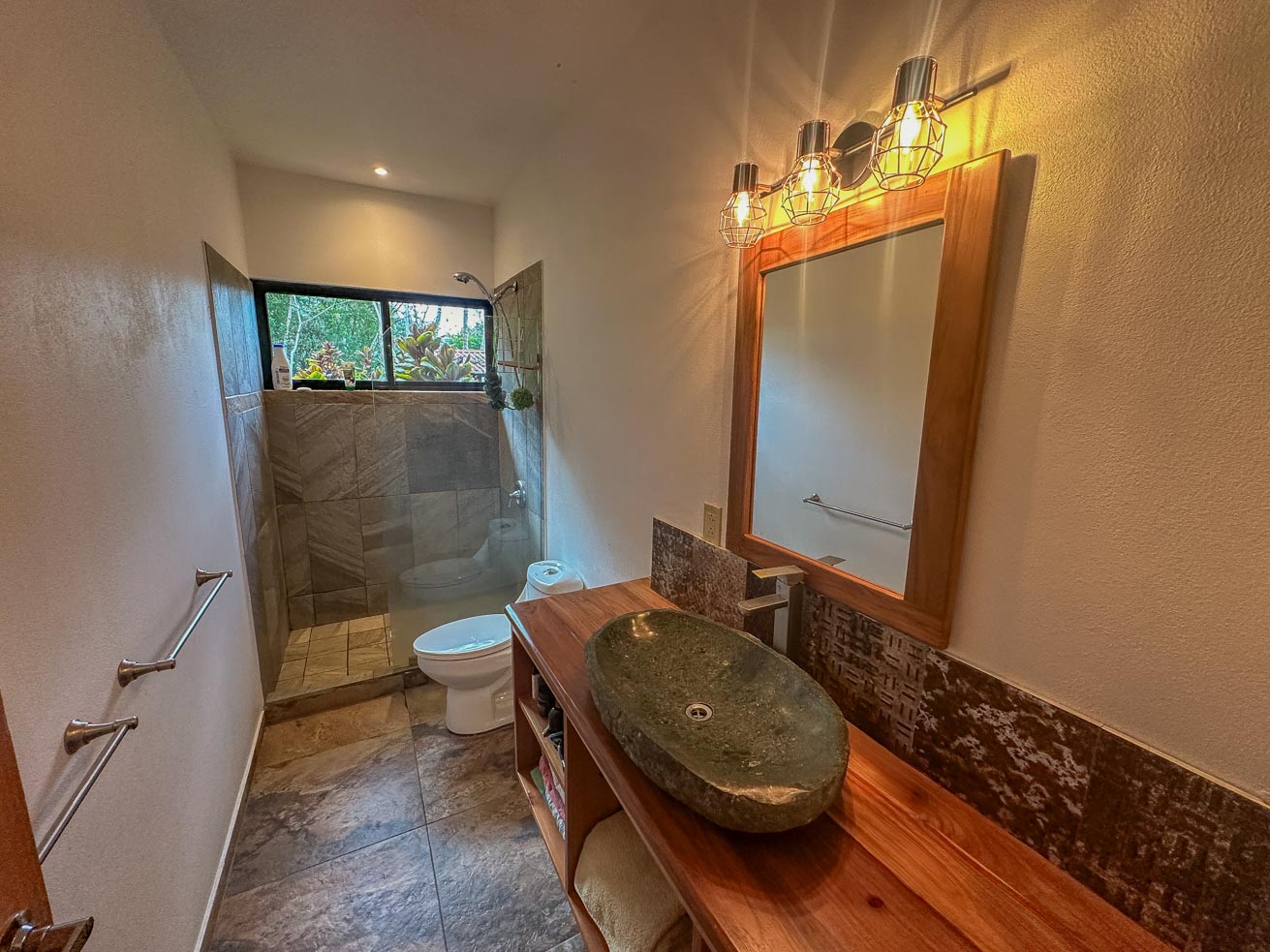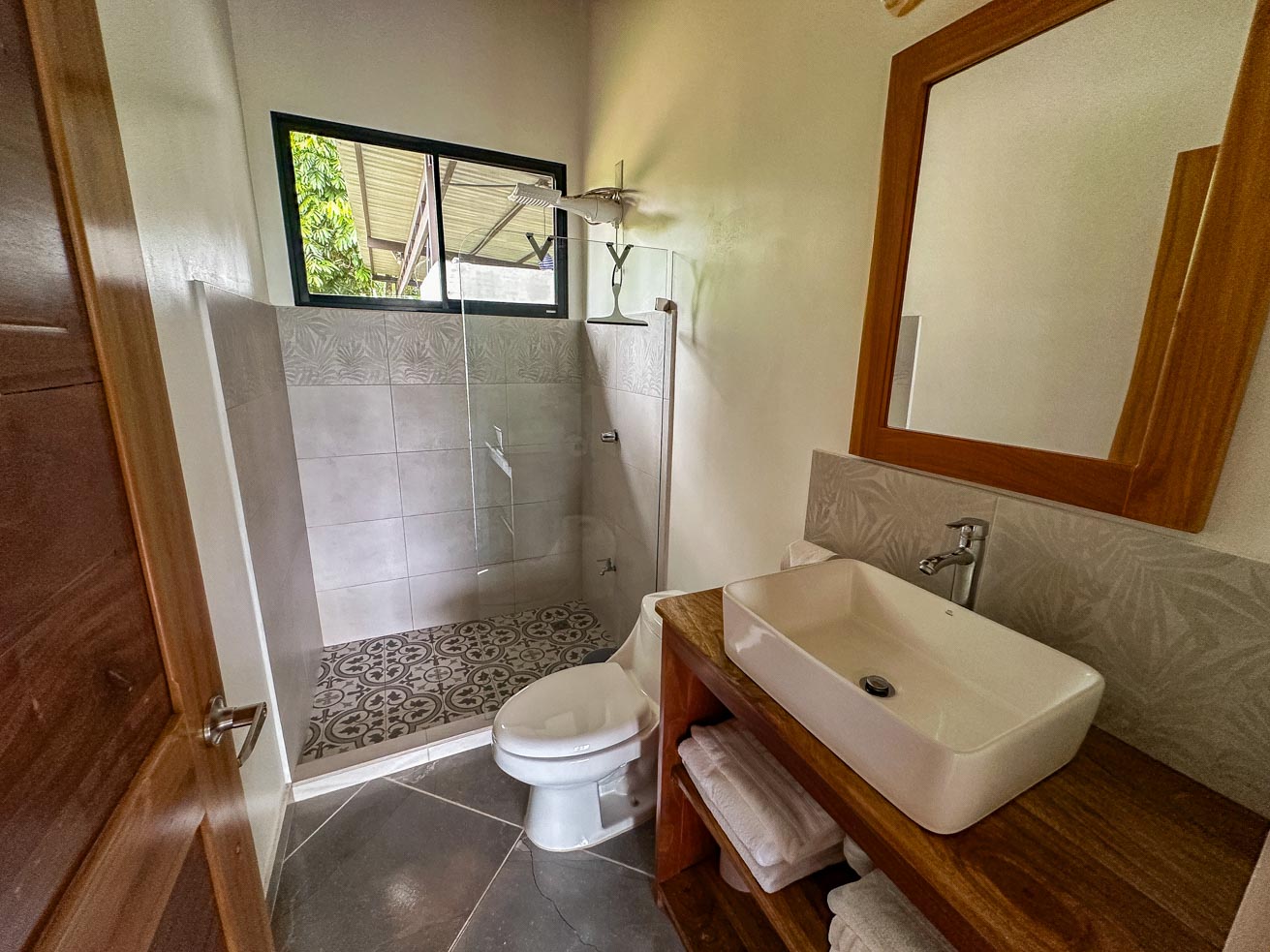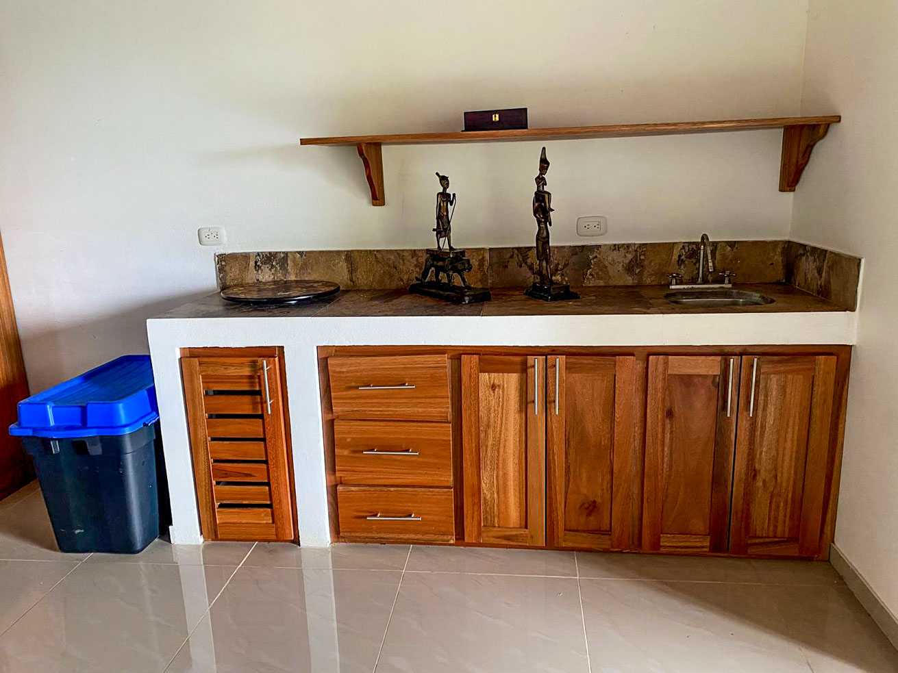 La casa de invitados, con dos dormitorios, un baño y un amplio patio, funciona como una residencia independiente. Sus techos altos, cochera para varios vehÃculos y diseño abierto aportan una sensación de amplitud y frescura. Los detalles en madera, molduras artesanales, tragaluces y abundante iluminación natural realzan el carácter del espacio. Una espaciosa terraza cubierta, bajo un elegante techo de madera, se convierte en el lugar perfecto para relajarse y contemplar la armonÃa de la selva circundante.