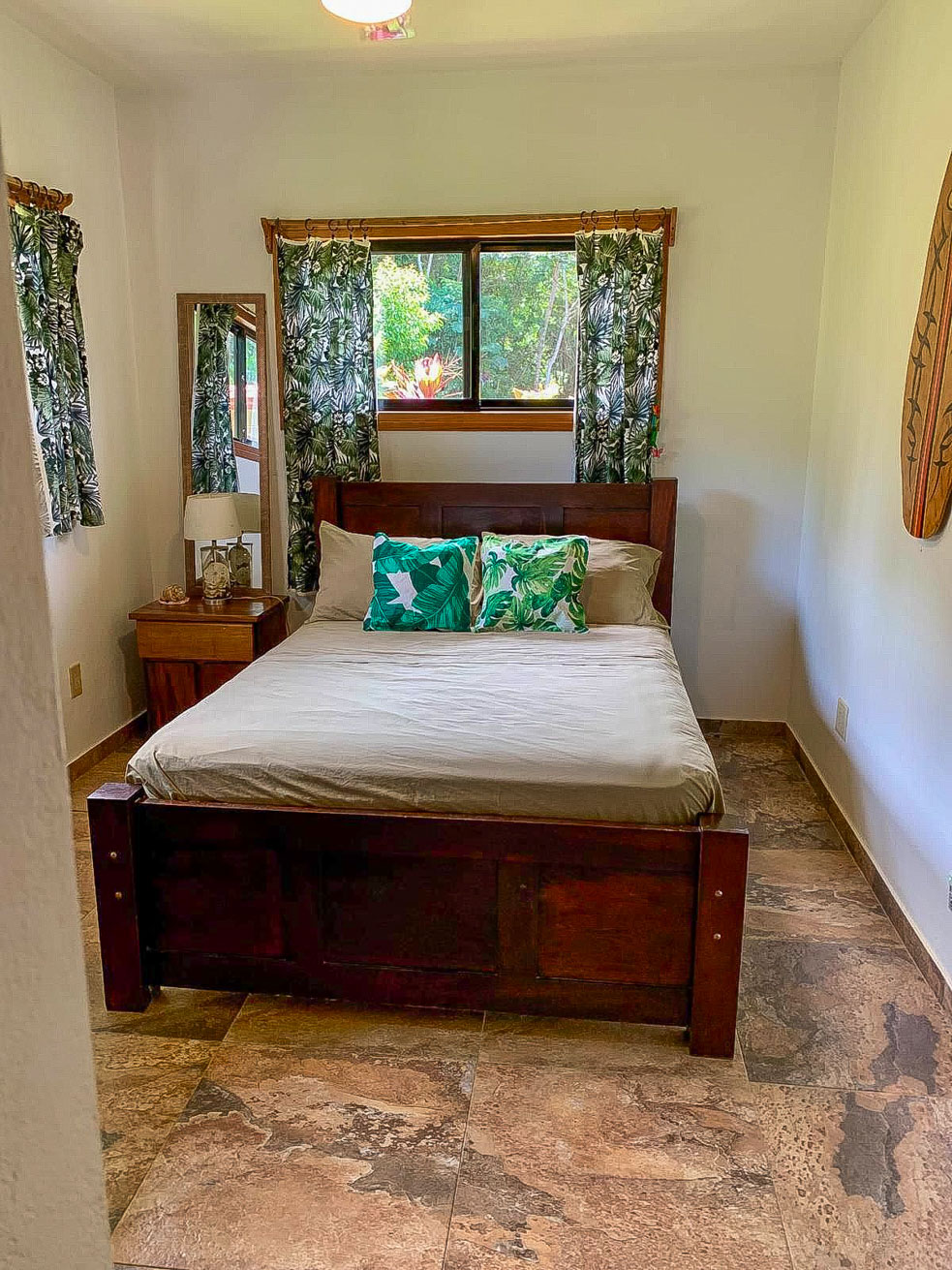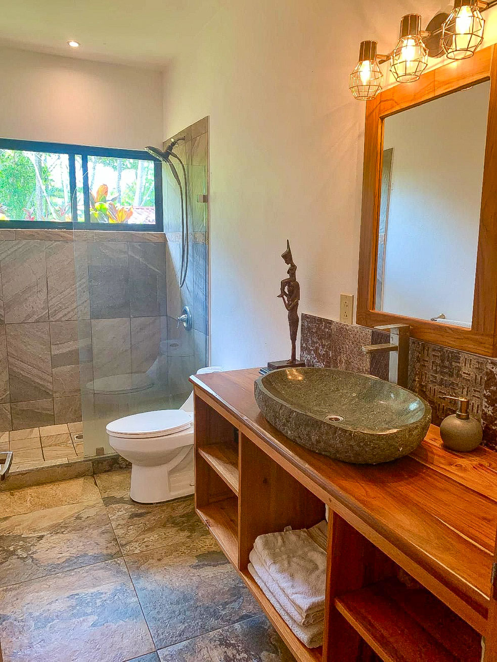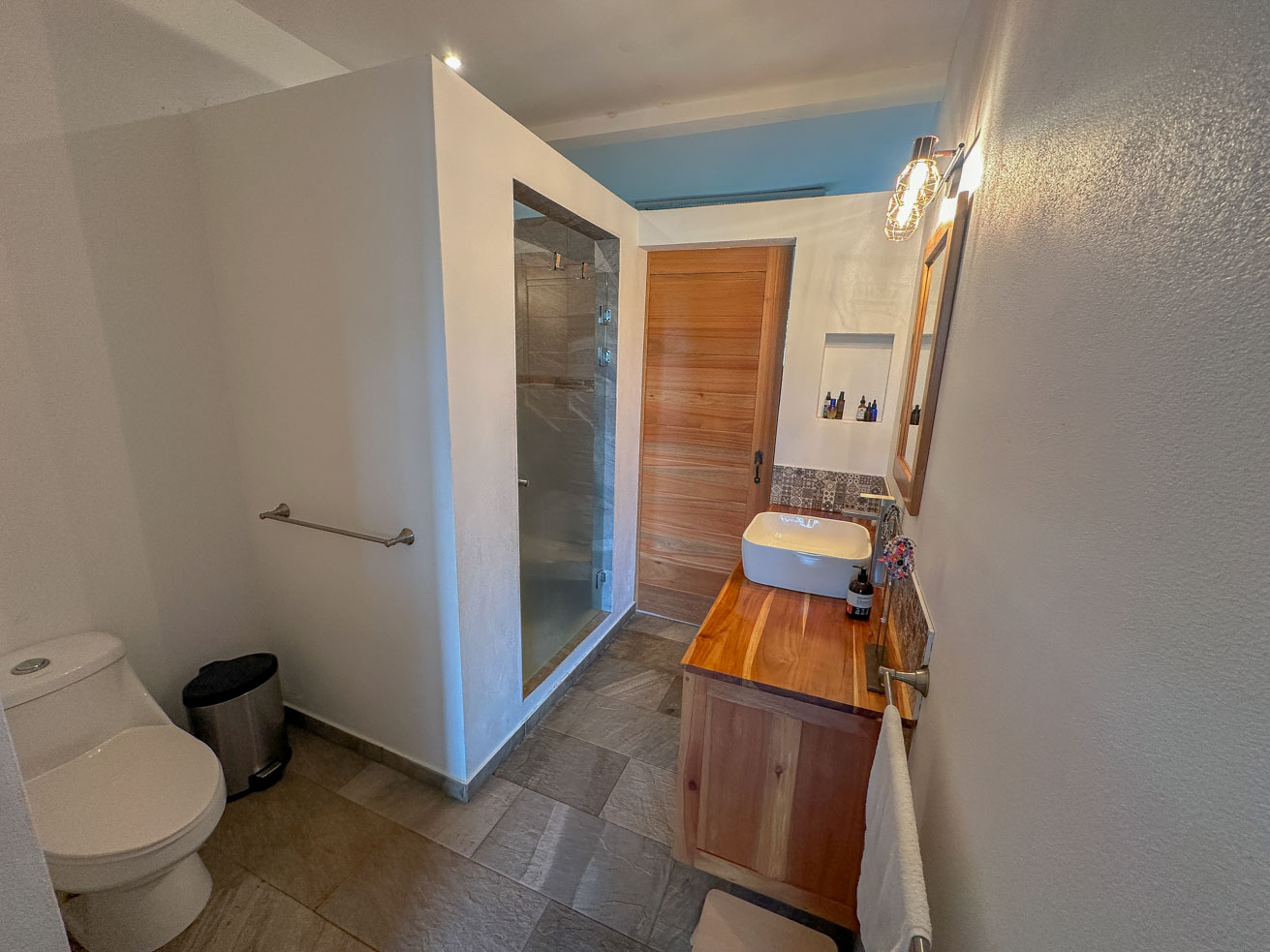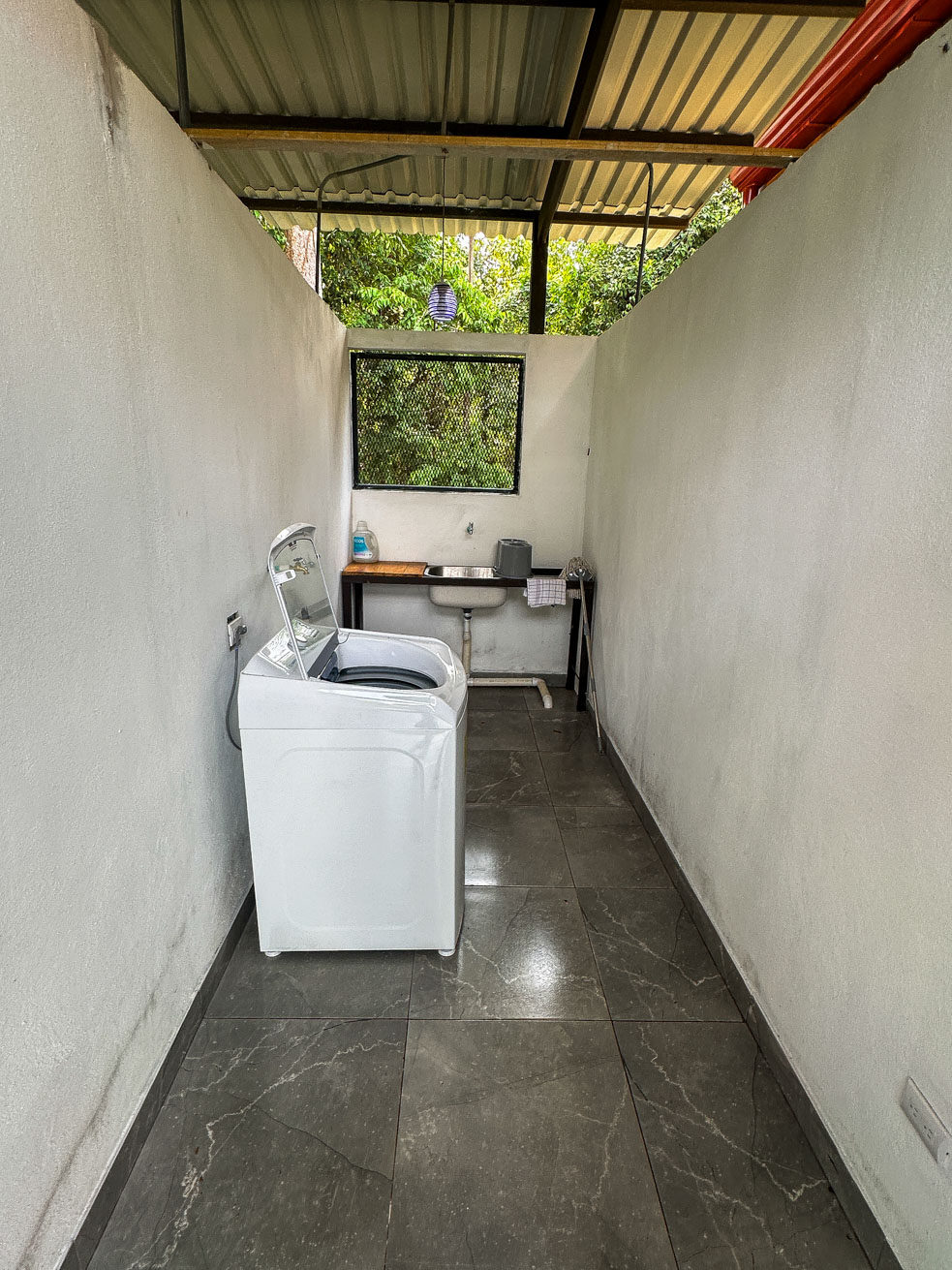 La casa de invitados, con dos dormitorios, un baño y un amplio patio, funciona como una residencia independiente. Sus techos altos, cochera para varios vehÃculos y diseño abierto aportan una sensación de amplitud y frescura. Los detalles en madera, molduras artesanales, tragaluces y abundante iluminación natural realzan el carácter del espacio. Una espaciosa terraza cubierta, bajo un elegante techo de madera, se convierte en el lugar perfecto para relajarse y contemplar la armonÃa de la selva circundante.