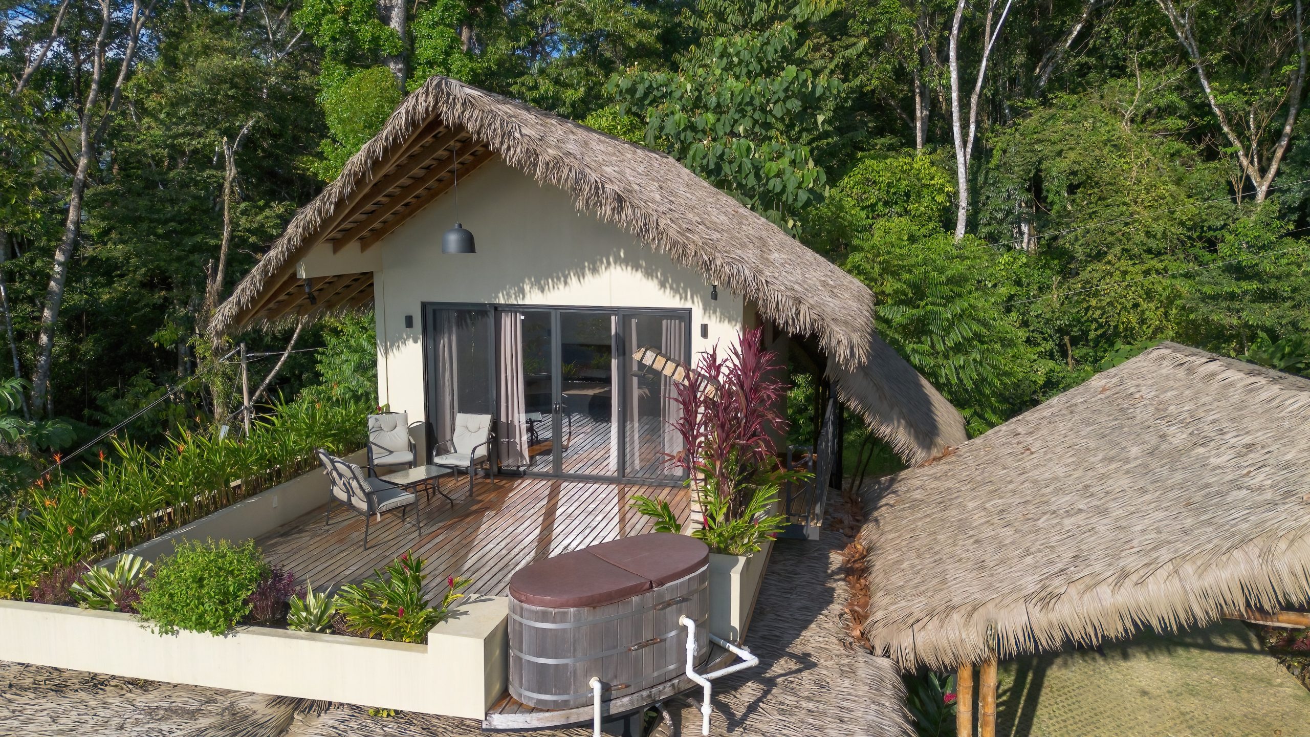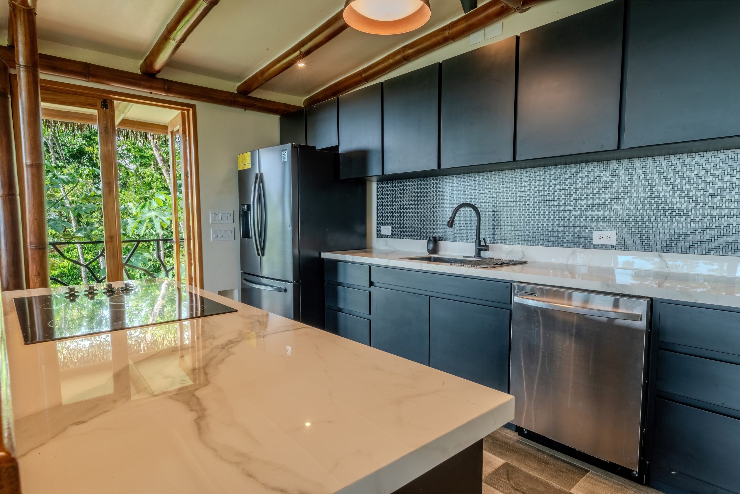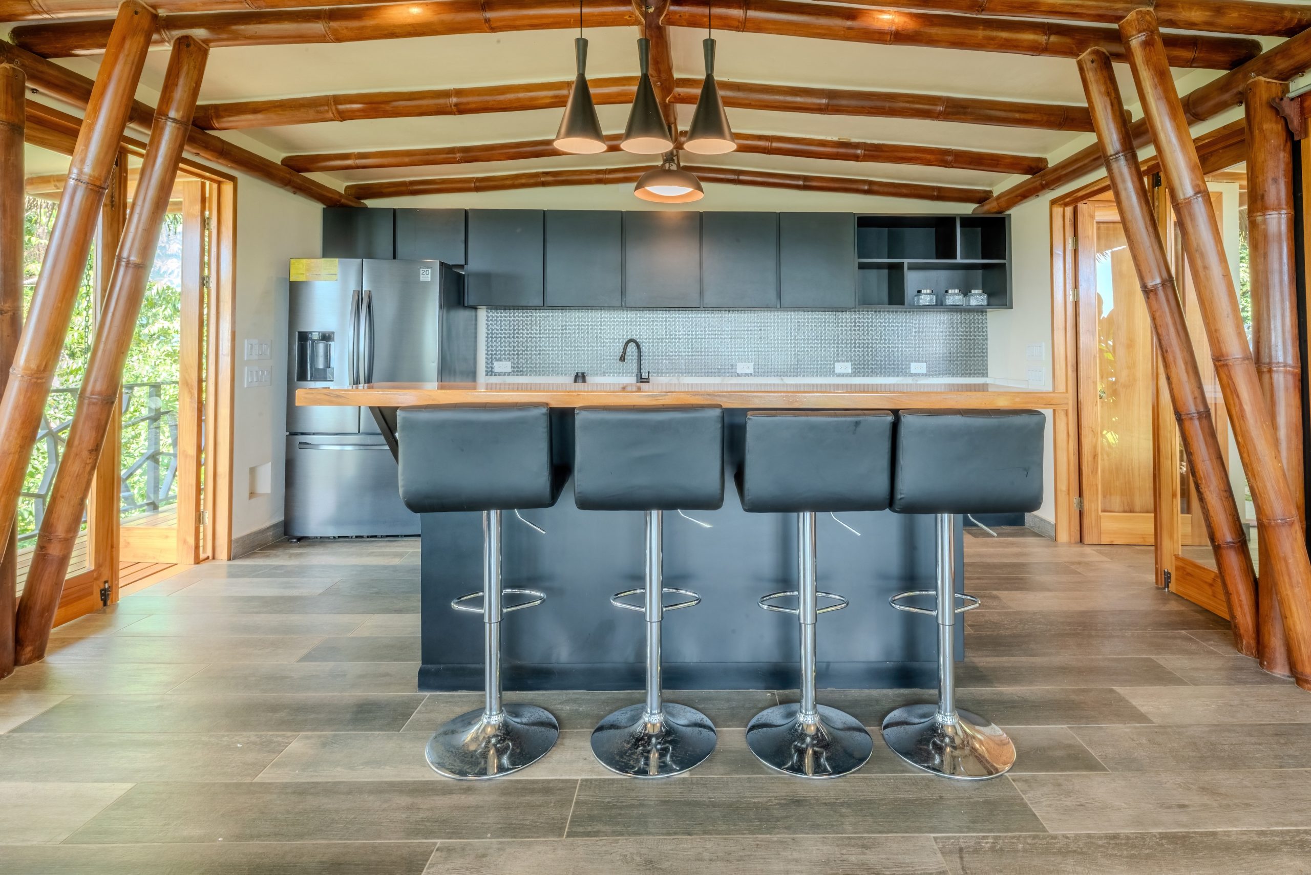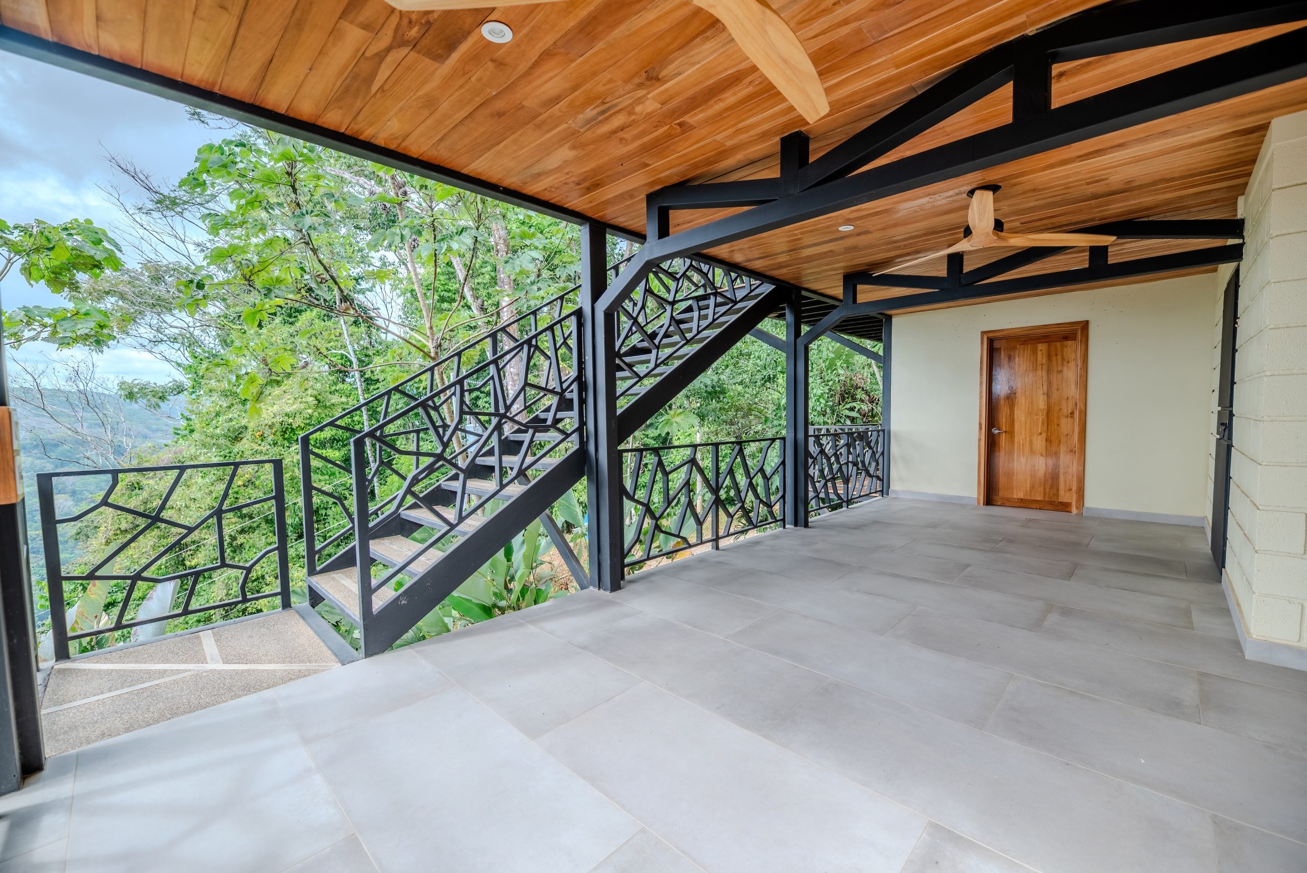 The interior is functional and well balanced. Granite countertops, solid wood doors, warm wood accents, and elegant metal stair railings create a sense of quality without excess. The spaces are bright, open, and oriented to capture natural breezes and sunset light, while the nearby jungle is a constant reminder that you are in a vibrant tropical environment.