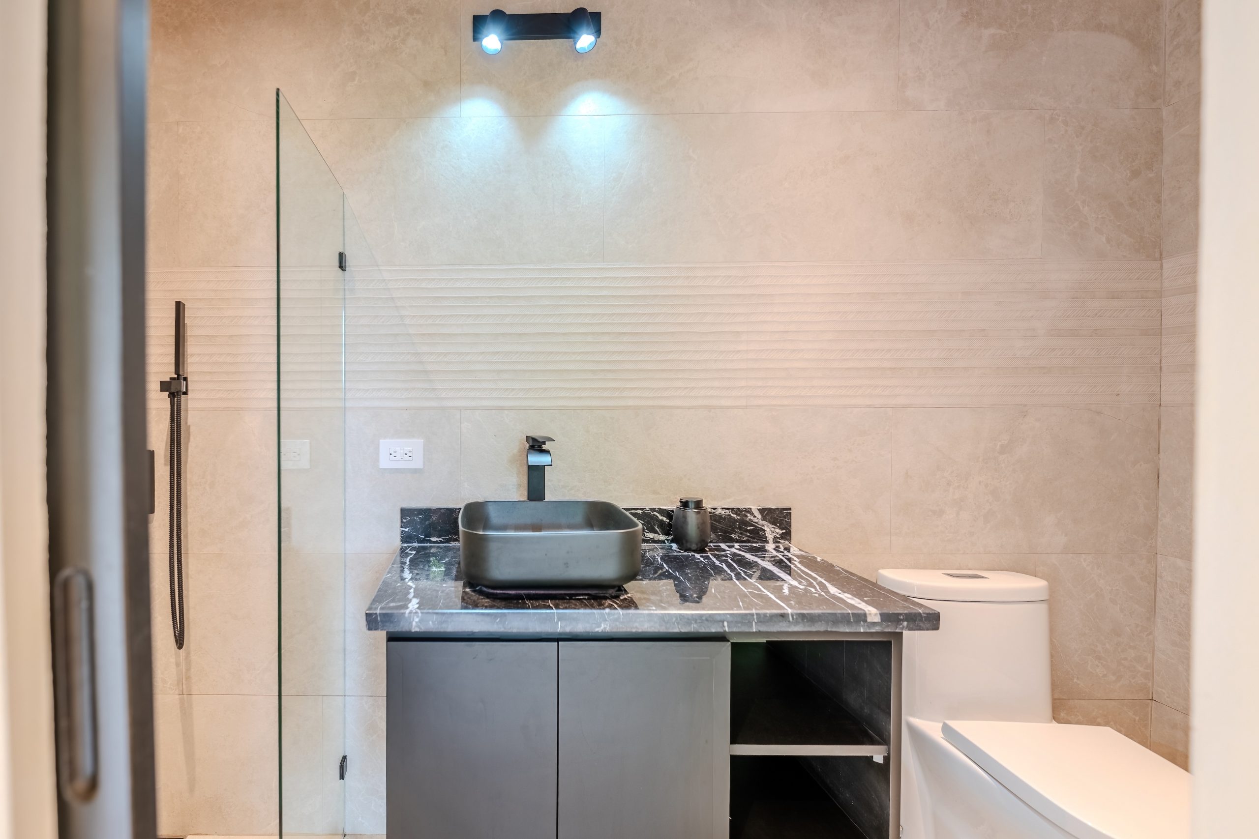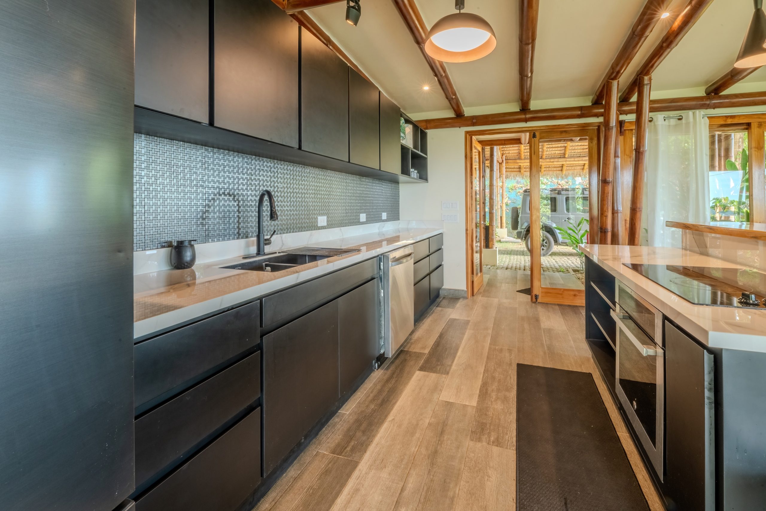 El interior es funcional y bien equilibrado. Encimeras de granito, puertas sólidas, cálidos detalles en madera y elegantes barandillas metálicas en las escaleras crean un ambiente de calidad sin excesos. Los espacios son luminosos, abiertos y orientados para aprovechar la brisa natural y la luz del atardecer, mientras la selva cercana recuerda constantemente que estás en un entorno tropical vibrante.
