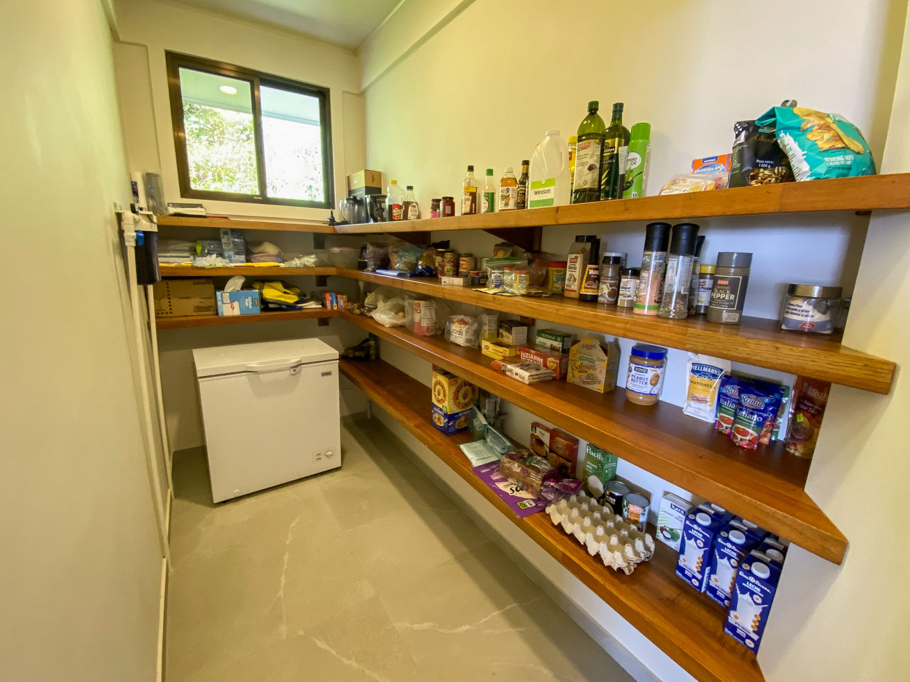 The interior—living room, kitchen, and dining room—serves as the social heart of the home. The spacious kitchen, perfect for gatherings, features a breakfast bar that complements the outdoor dining area. It boasts ample counter space and storage. The living room includes a comfortable L-shaped sofa, a television, and a stunning designer wooden cabinet. Two full bathrooms, a large pantry with a freezer, additional storage space, and a fully equipped laundry room complete the layout. The house is air-conditioned and decorated with colorful tropical artwork and stylish accessories.