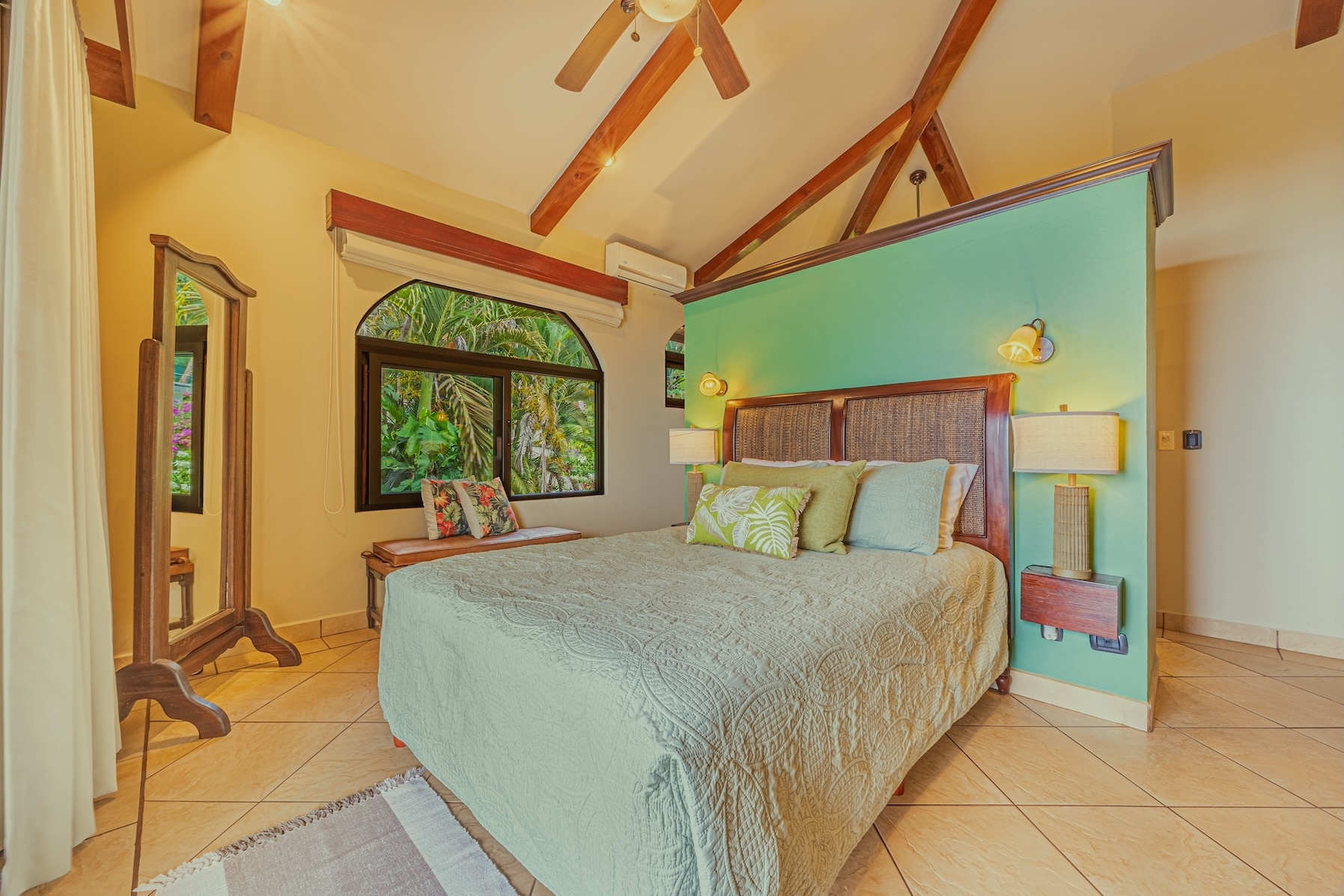 Upon entering, a spacious open-concept living room welcomes you with high cathedral ceilings and floor-to-ceiling windows that frame unforgettable sunsets and the natural spectacle of tropical storms over the sea.