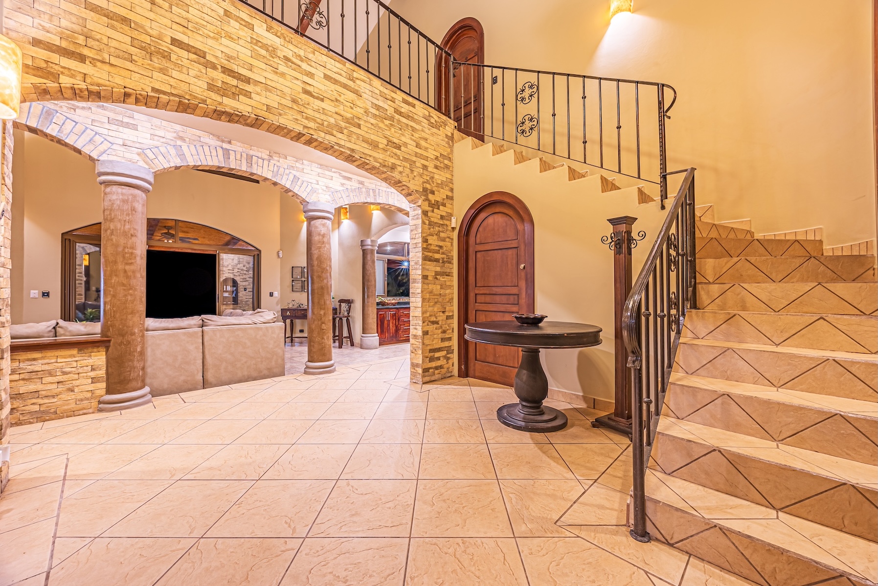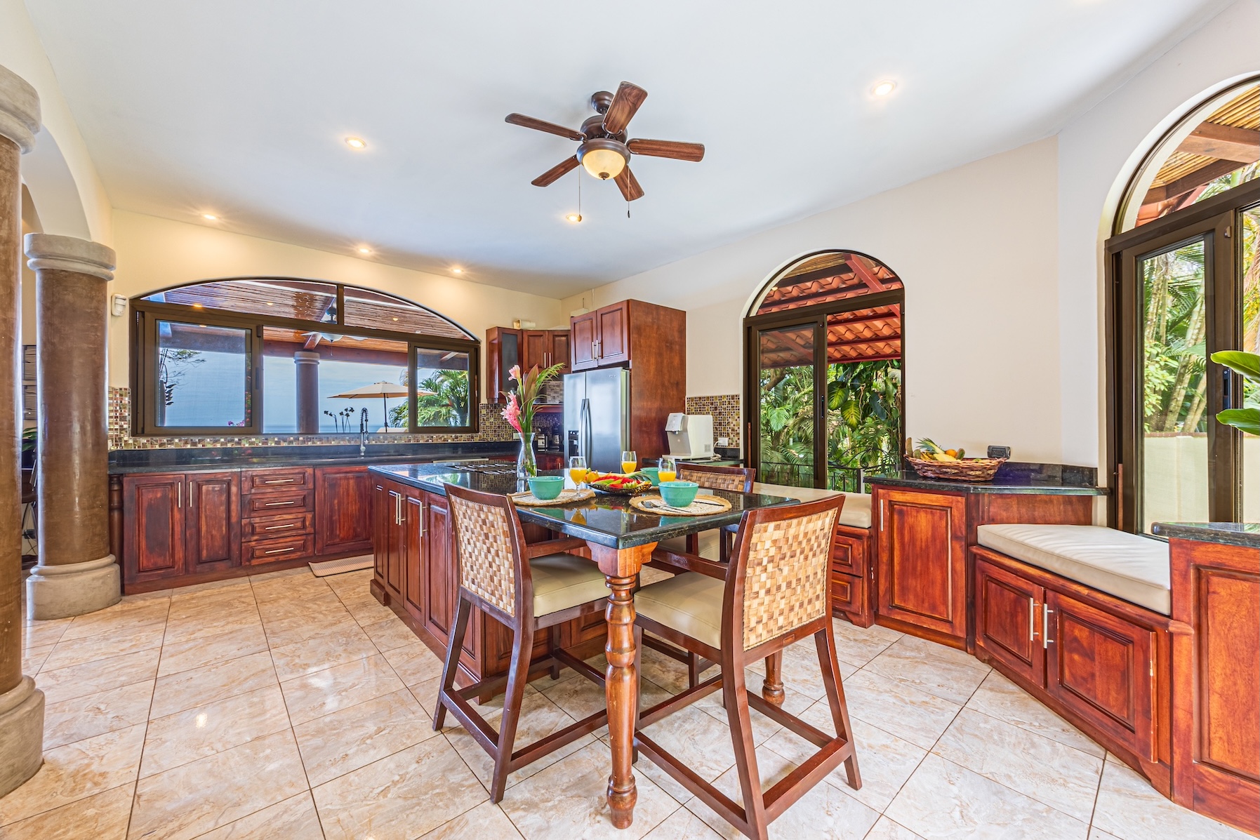 Al ingresar, una amplia sala de estar de concepto abierto recibe con techos altos estilo catedral y ventanales de piso a techo que enmarcan puestas de sol inolvidables y el espectáculo natural de las tormentas tropicales sobre el mar.
