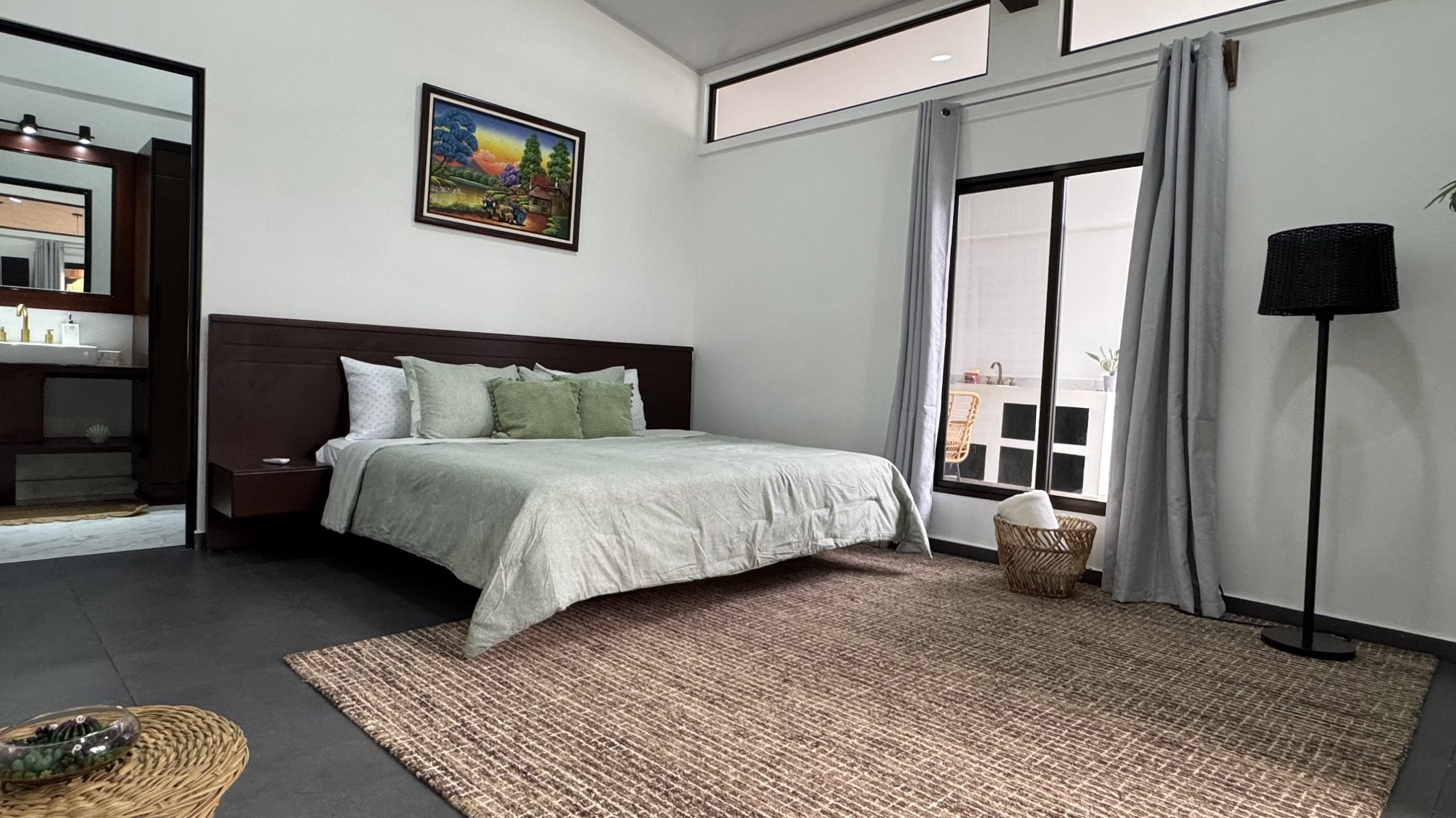 The master bedroom, located on the right wing, features a king-size bed, a private bathroom, and views of the garden and pool. In the opposite wing, two guest bedrooms share a fully tiled bathroom, one of them almost as large as the master bedroom and also overlooking the pool.