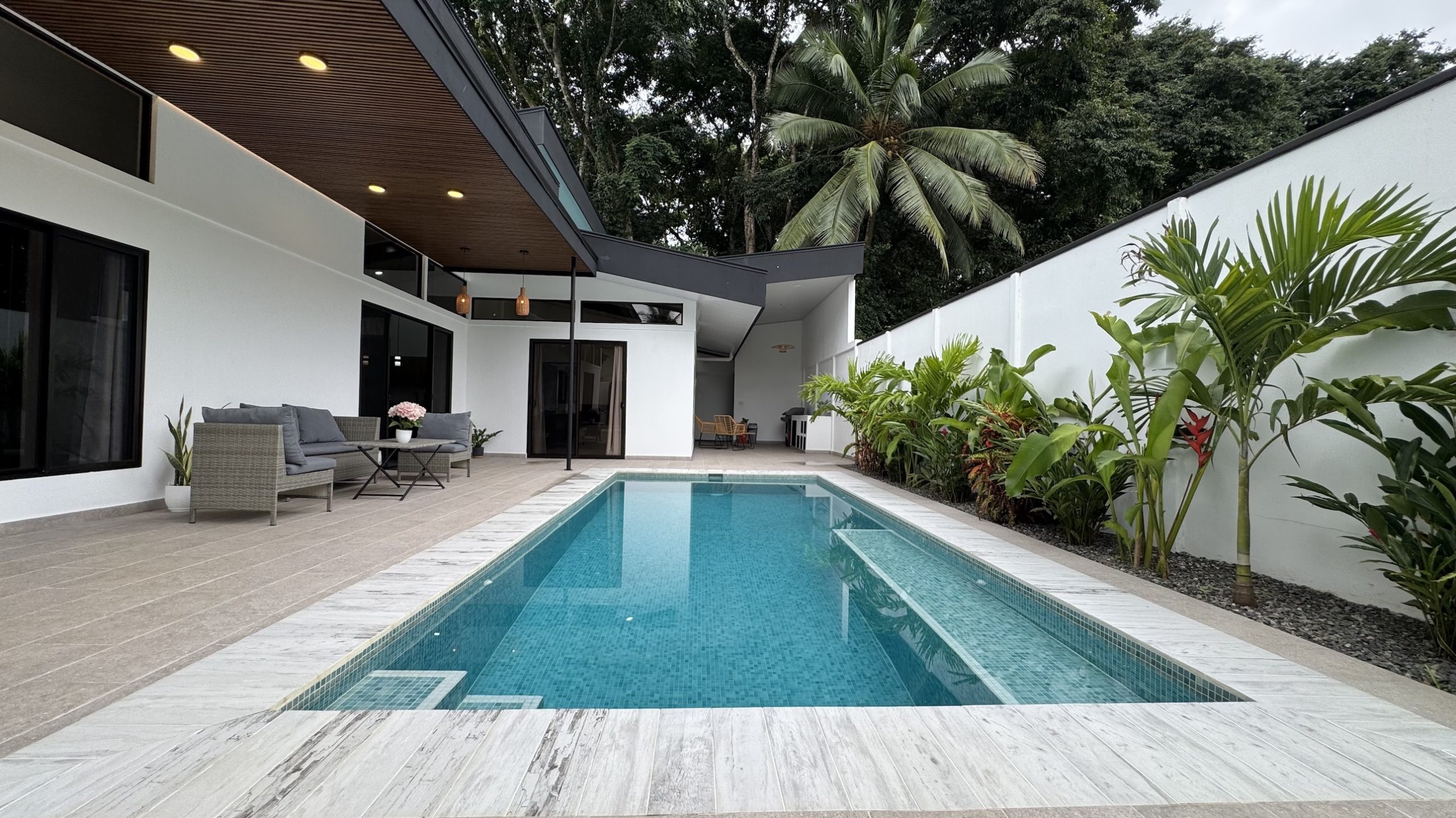 This elegant 3-bedroom, 2-bathroom home features an open-plan layout that seamlessly integrates the interior with the outdoors. The spacious covered terrace, recessed ambient lighting, and sliding glass doors lead to the pool surrounded by tropical gardens. An outdoor barbecue area makes the space the ideal place to relax or entertain.