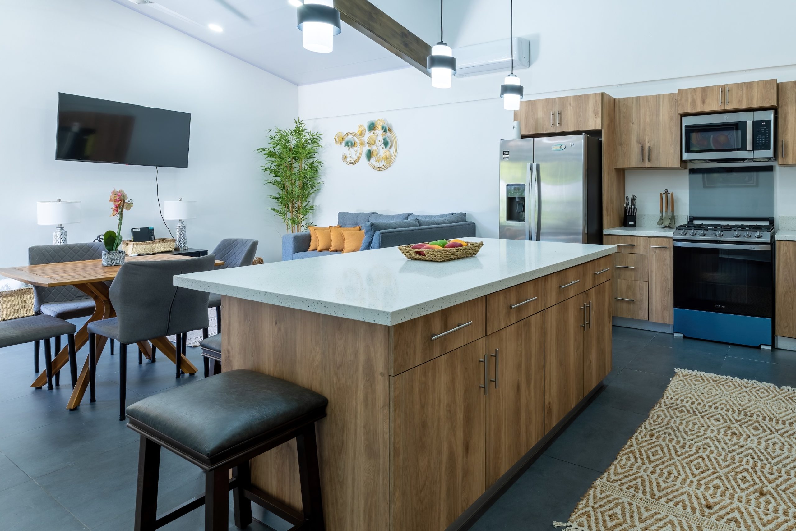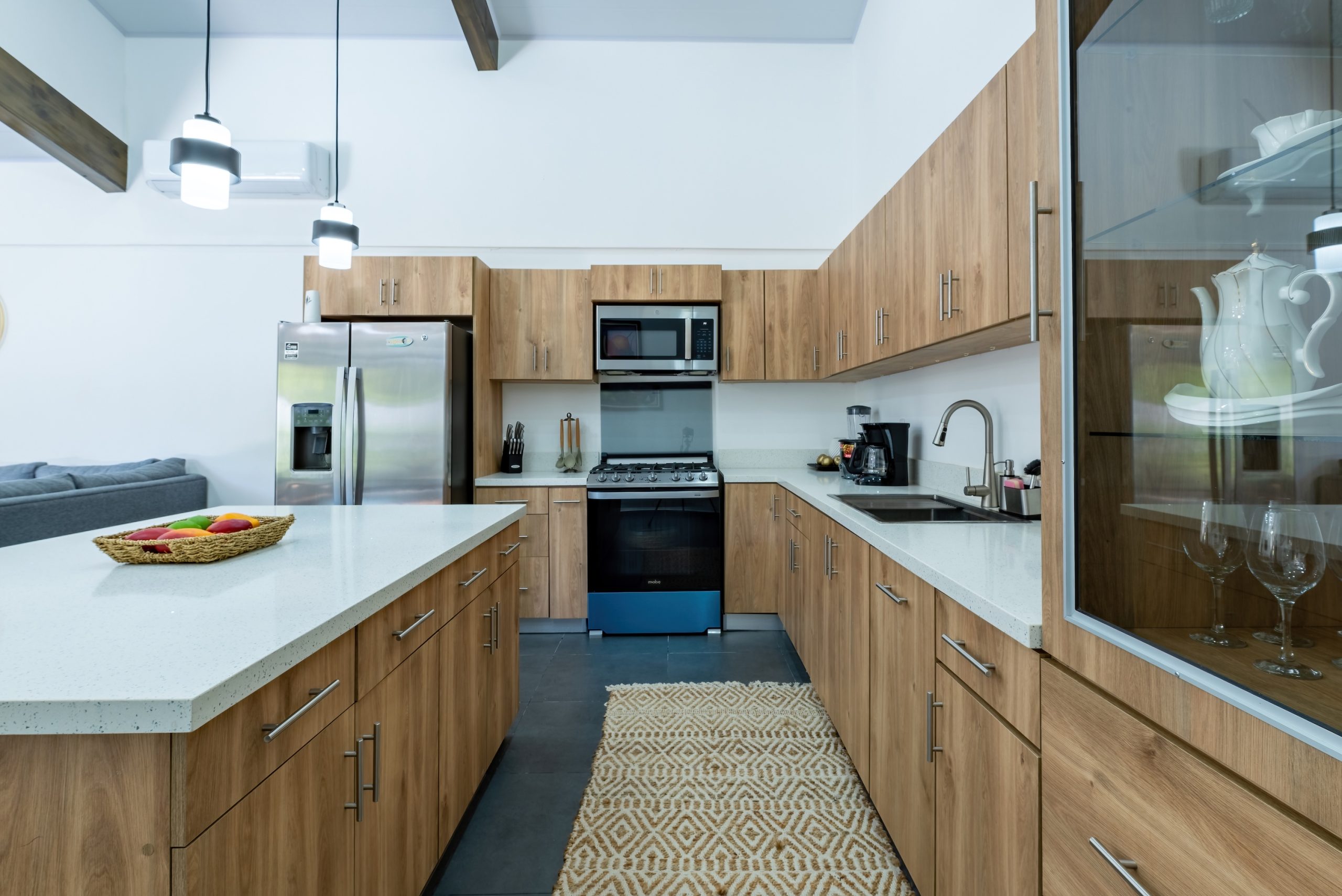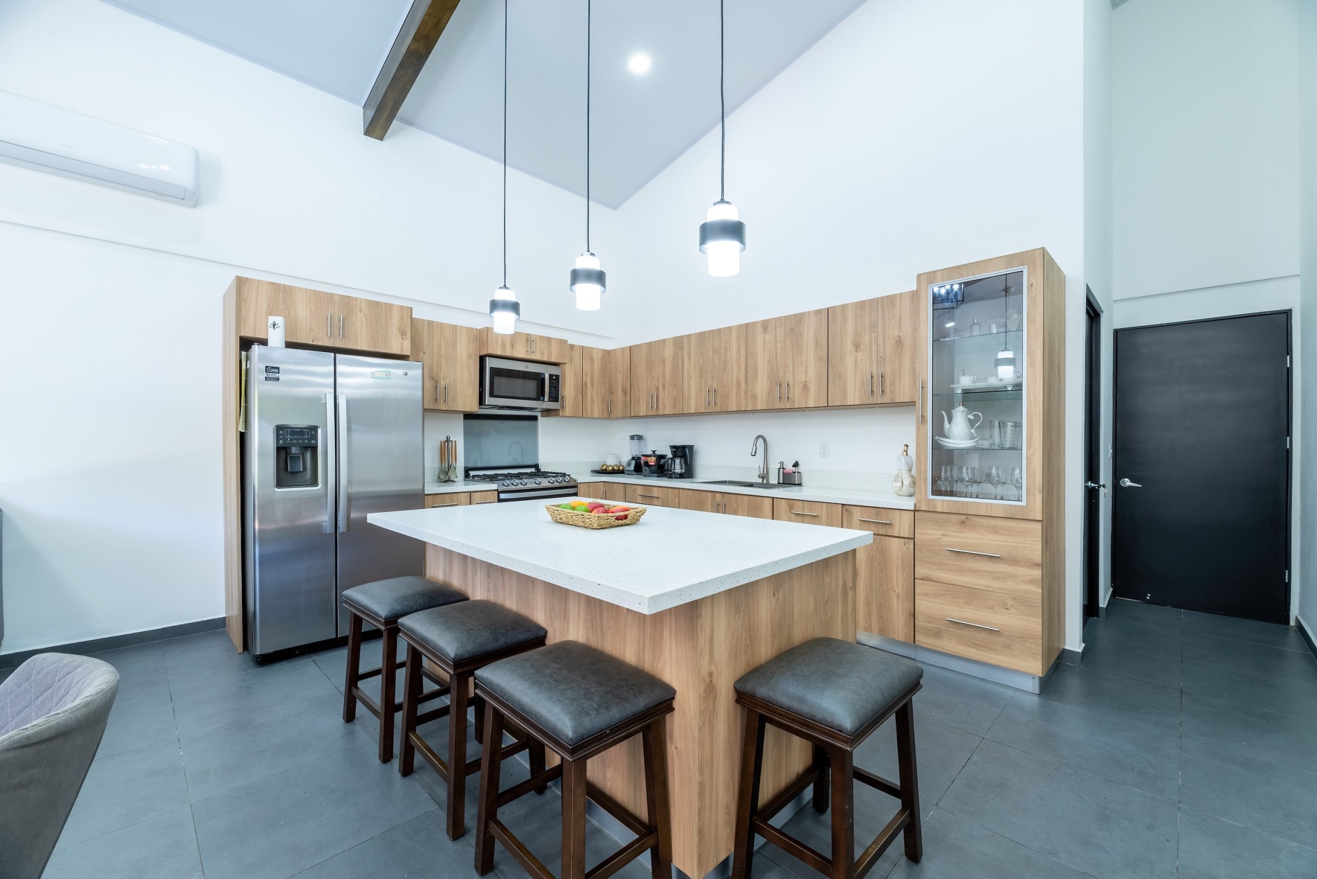 En el interior, una sala y comedor amplios se conectan con una cocina de diseño personalizado equipada con encimeras de cuarzo, refrigerador de doble puerta vertical y modernos electrodomésticos de acero inoxidable. Los techos altos, el aire acondicionado y los ventiladores de techo garantizan comodidad durante todo el año. Detrás de la cocina, se encuentra un lavadero espacioso con salida a la zona de equipos de la piscina.